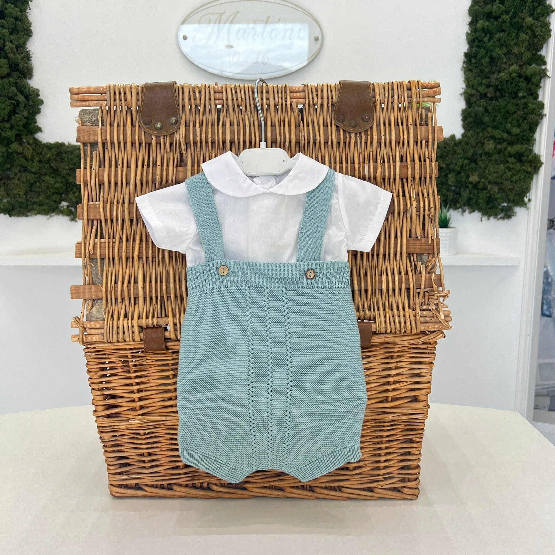 Completo per neonato composto da pagliaccetto con bretelle in filo di cotone, caratterizzato da trafori frontali, abbinato a camicia in cotone con colletto rotondo e mezza manica. Un outfit elegante e fresco, ideale per le prime occasioni.