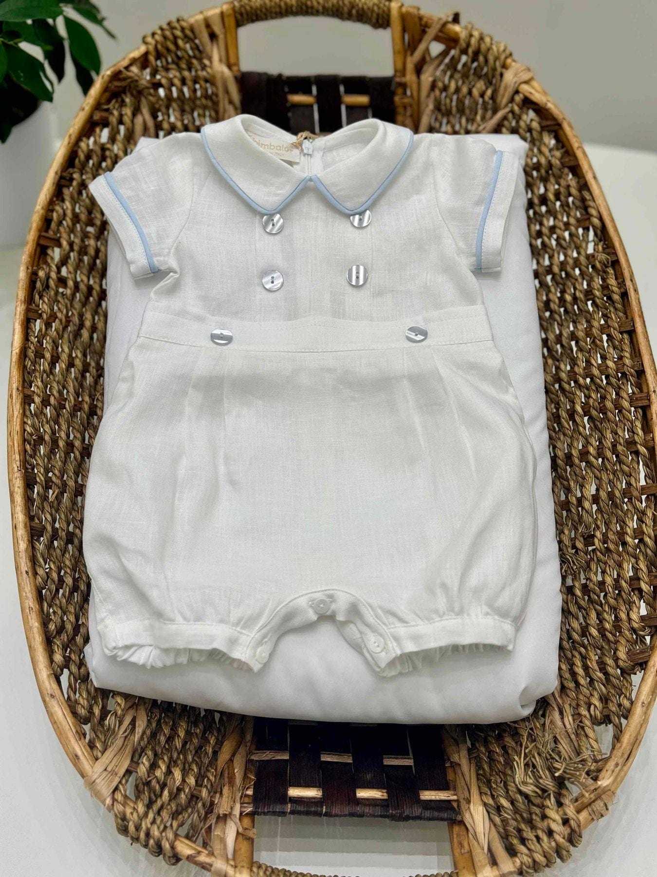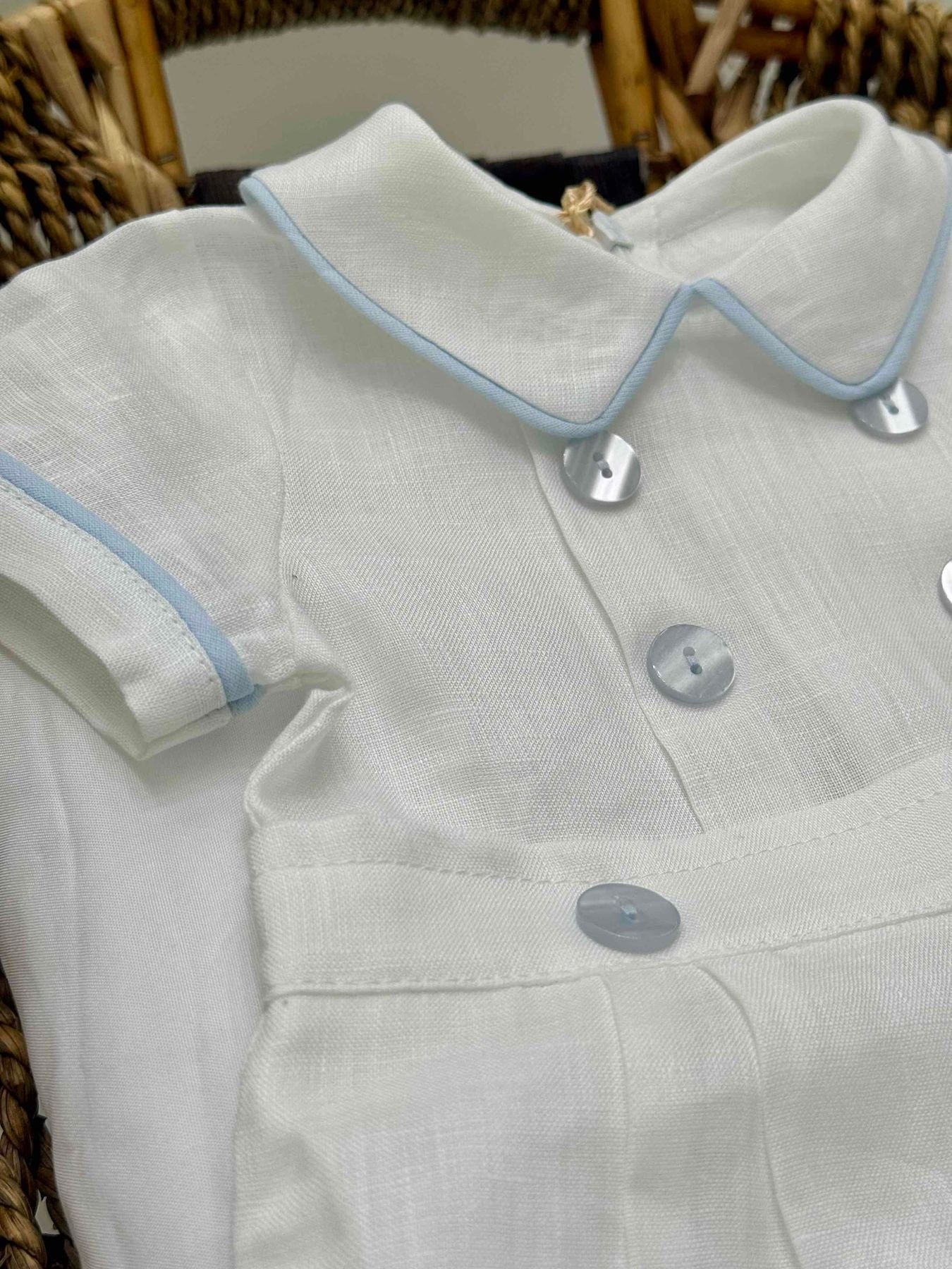 Pagliaccetto neonato in lino con colletto bordato in azzurro e bottoni frontali.