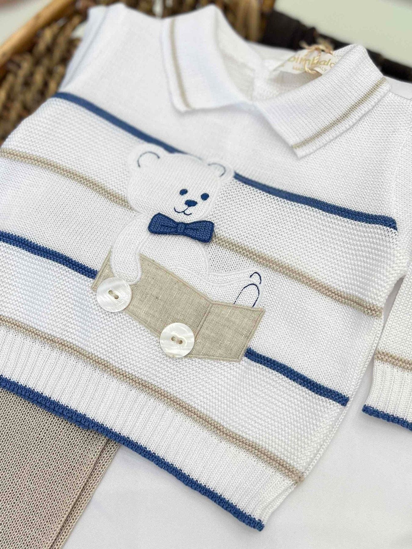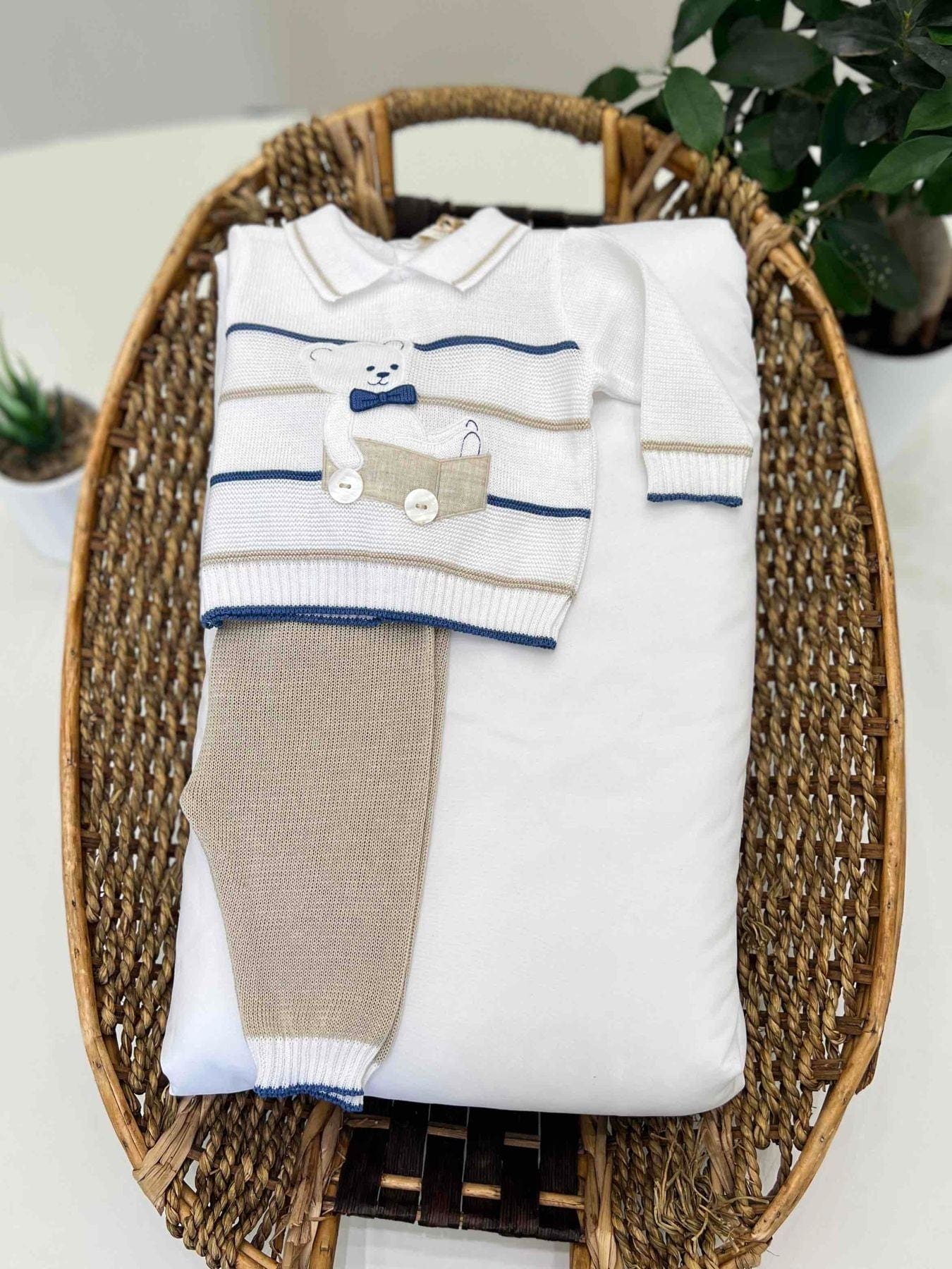 Maglia manica lunga, trama a righe con orsetto e pantalone a contrasto beige.