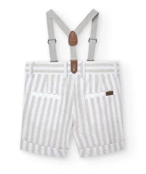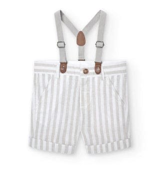 Queste bermudas in lino per bambini sono l'ideale per l'estate, sono caratterizzate da un design a righe e un tessuto piatto. Il colore è un elegante Pietra Listato. La chiusura è a bottone, facile da usare per i piccoli. I tiranti aggiungono un tocco di stile e rendono queste bermudas adatte per ogni occasione. Sono la scelta perfetta per i genitori che cercano un capo d'abbigliamento comodo e alla moda per i loro bambini.