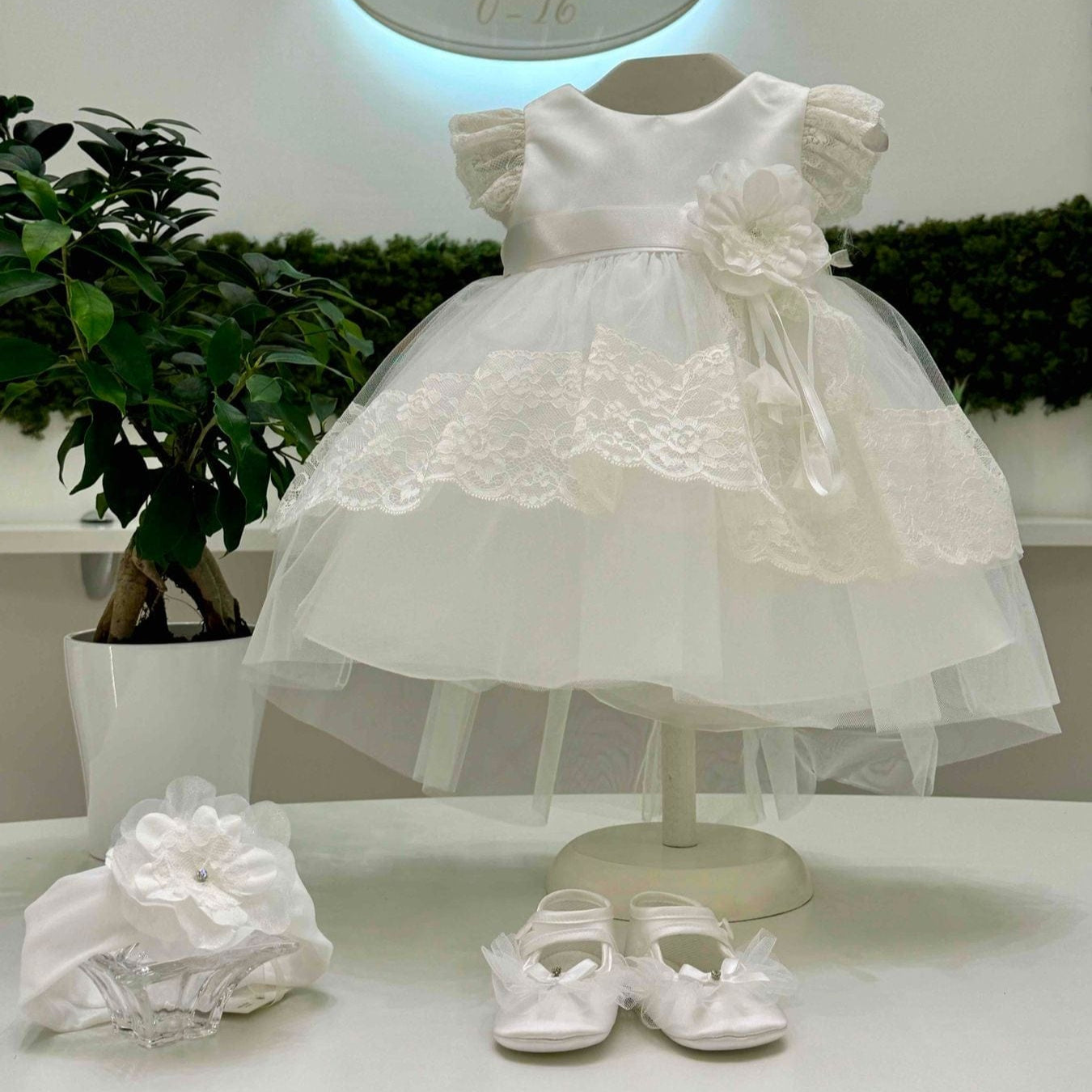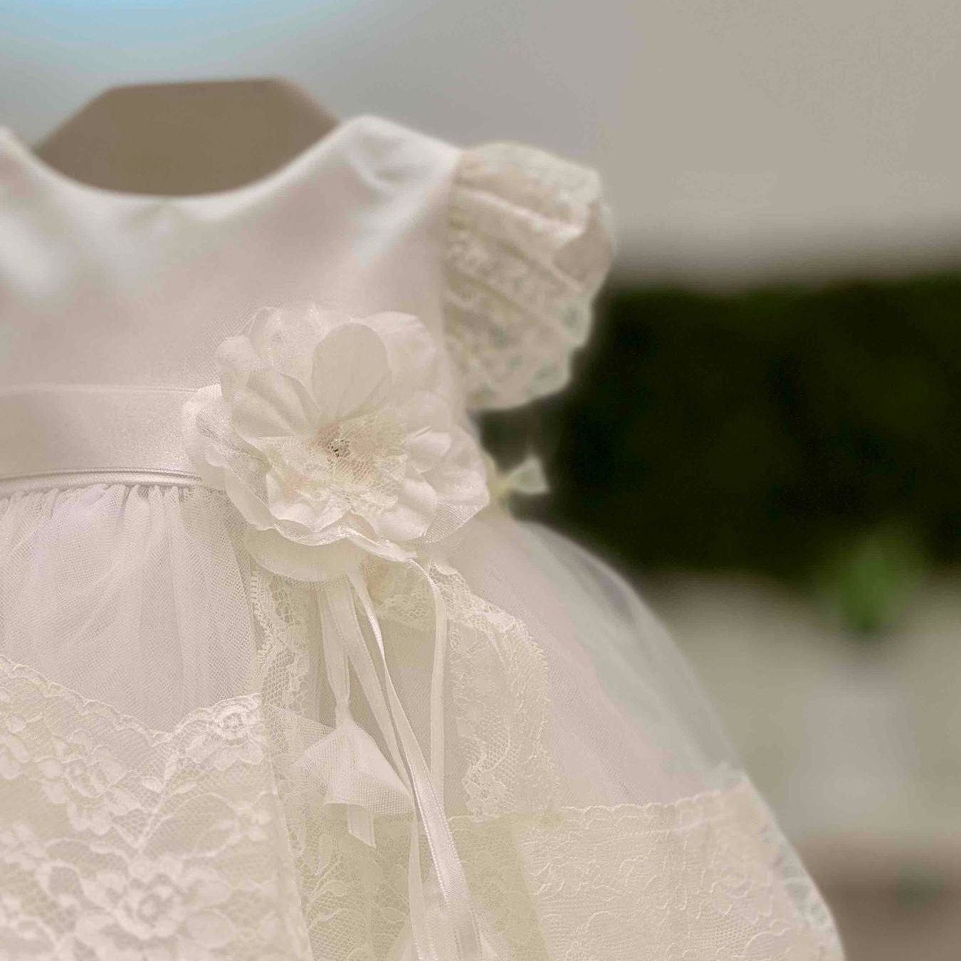 Abito battesimale neonata in tulle doppia balza bordata in pizzo.