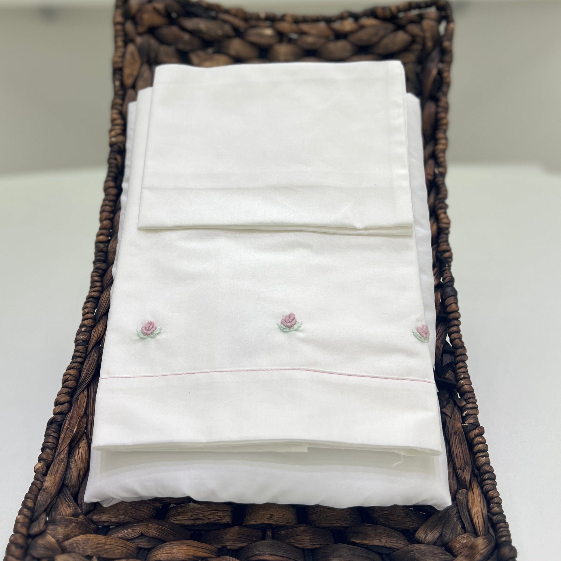 Set lenzuola tre pezzi per culla o navicella in cotone con fiorellini a vapore ricamati.