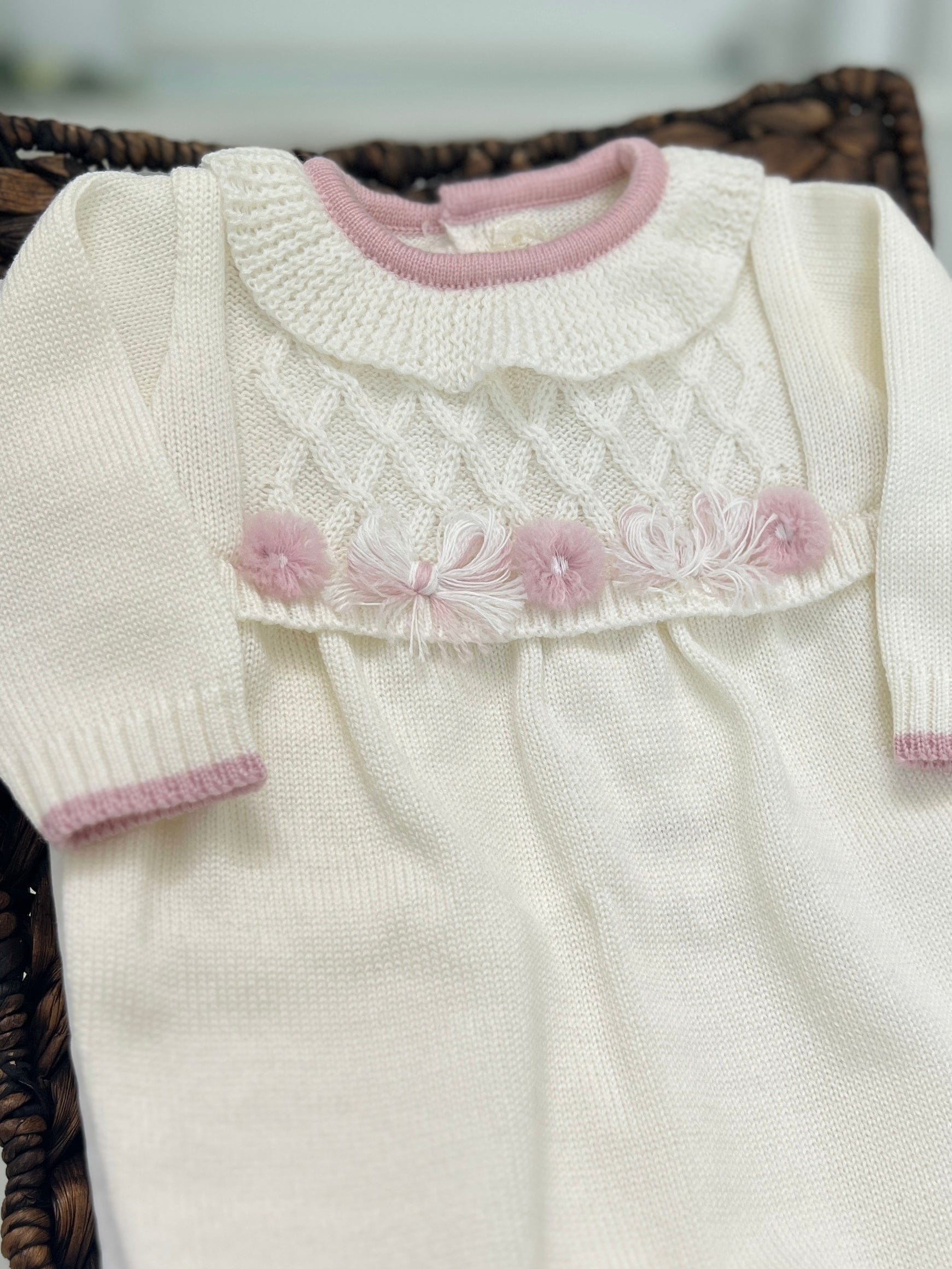 Una tutina intera per neonata in lana color panna, arricchita da delicati contrasti in rosa. Il punto smock sul petto aggiunge un tocco di eleganza, con piccoli fiorellini ricamati in fili di cotone che donano dolcezza al design. Una scelta raffinata e confortevole per la tua piccola. Sul retro e sul cavallo è fornita di bottoni, per un cambio pratico e veloce.