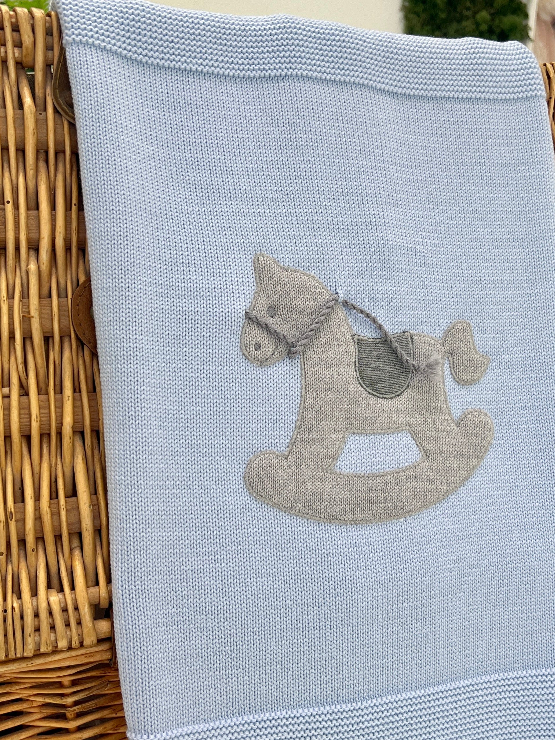 La copertina in lana celeste per neonato è soffice e accogliente, realizzata con una lavorazione semplice che mette in risalto la qualità del filato. Al centro della copertina è ricamato un cavallo a dondolo, simbolo di dolcezza e tradizione. Il cavallino, con dettagli accurati come la criniera e la sella, è realizzato con fili di lana in tonalità più scure, creando un piacevole contrasto con il fondo celeste. Il ricamo aggiunge un tocco di classicità, rendendo la copertina non solo funzionale, ma anche un prezioso ricordo per il neonato.