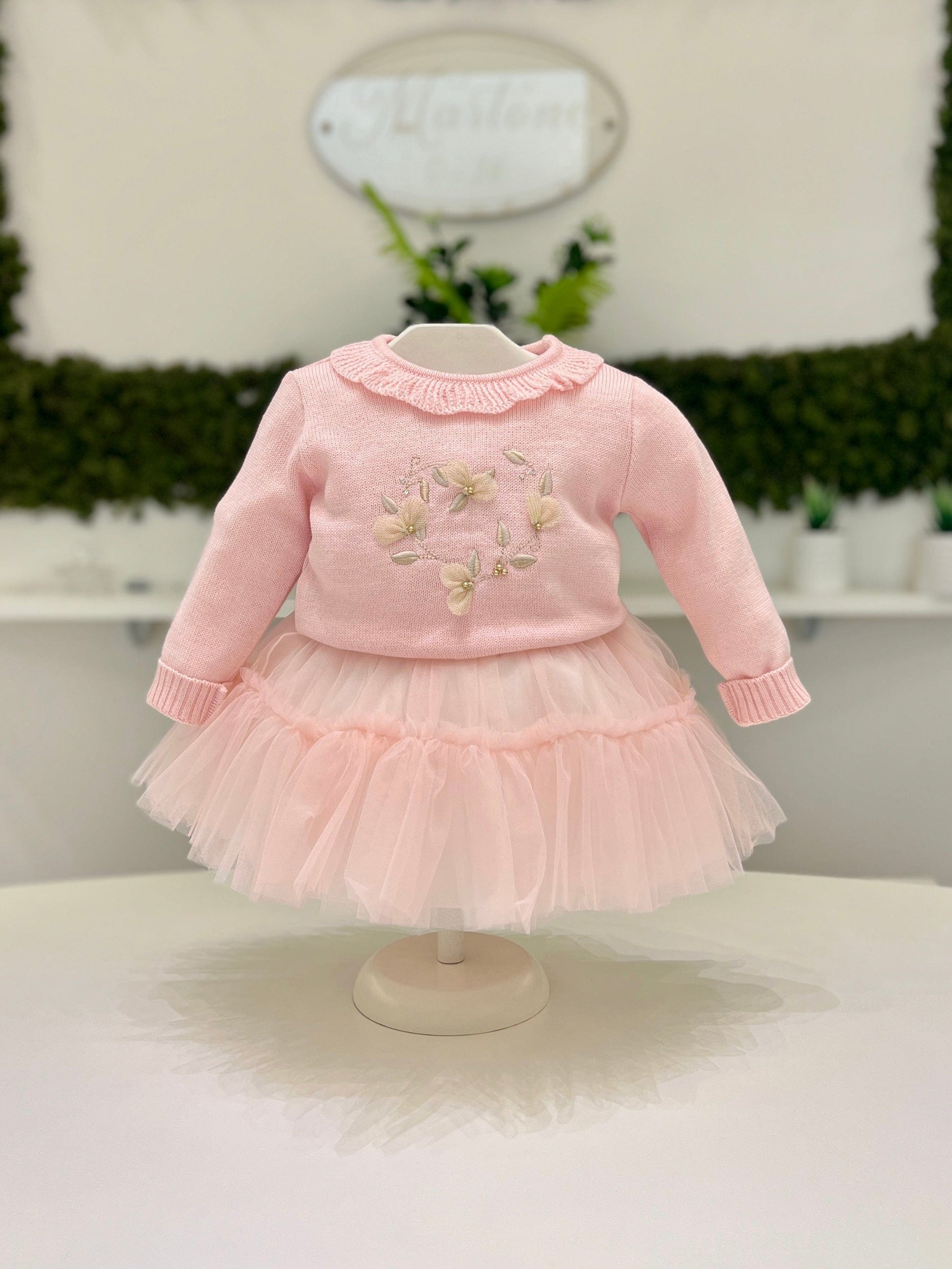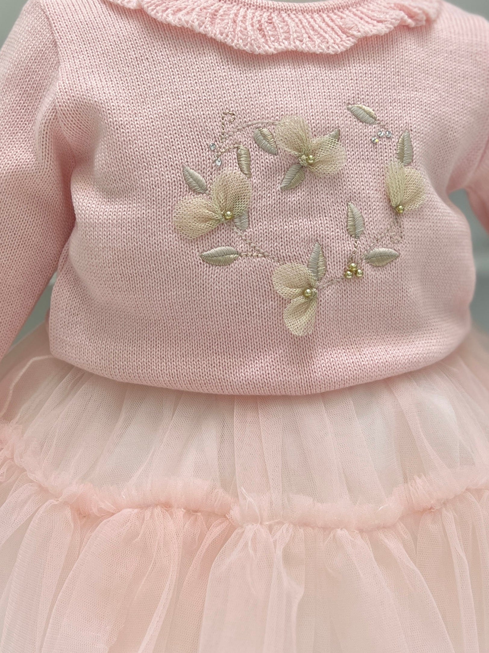 Un delizioso completo per bimba composto da un maglione rosa in lana, con rouches delicate sul colletto e decorazioni beige che aggiungono un tocco elegante. La gonna in tulle a balze, leggera e vaporosa, completa l'outfit con uno stile femminile e giocoso, perfetto per un look dolce e raffinato.