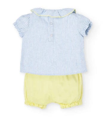 Questo è un grazioso set combinato per bambina. Il set è caratterizzato da un design a righe e un colore azzurro chiaro, perfetto per l'estate. Il tessuto è liscio, garantendo comfort e facilità di movimento. Il collo è rotondo e le maniche sono corte, rendendo il set ideale per i giorni più caldi. Nonostante il set abbia un bottone come chiusura, questo non compromette la facilità di vestibilità. Questo set combinato è un'aggiunta versatile e pratica al guardaroba di ogni bambina.