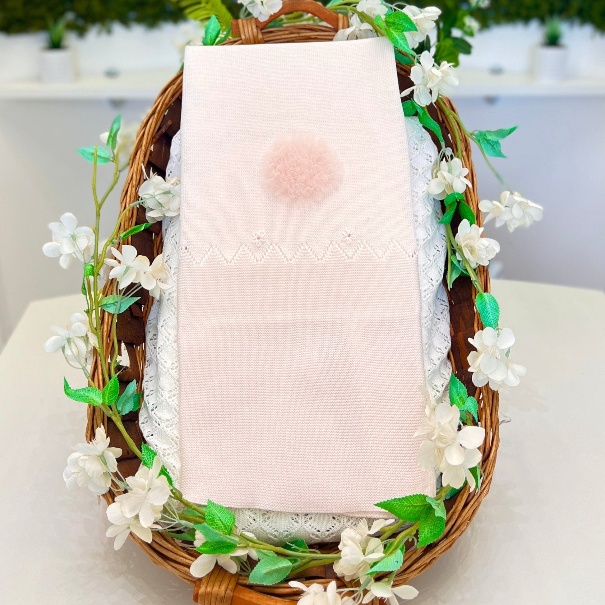 Copertina in filo di cotone con delicata lavorazione traforata, impreziosita da un dettaglio tridimensionale in tulle e fiorellini ricamati. Un accessorio raffinato e romantico, ideale per le prime uscite.