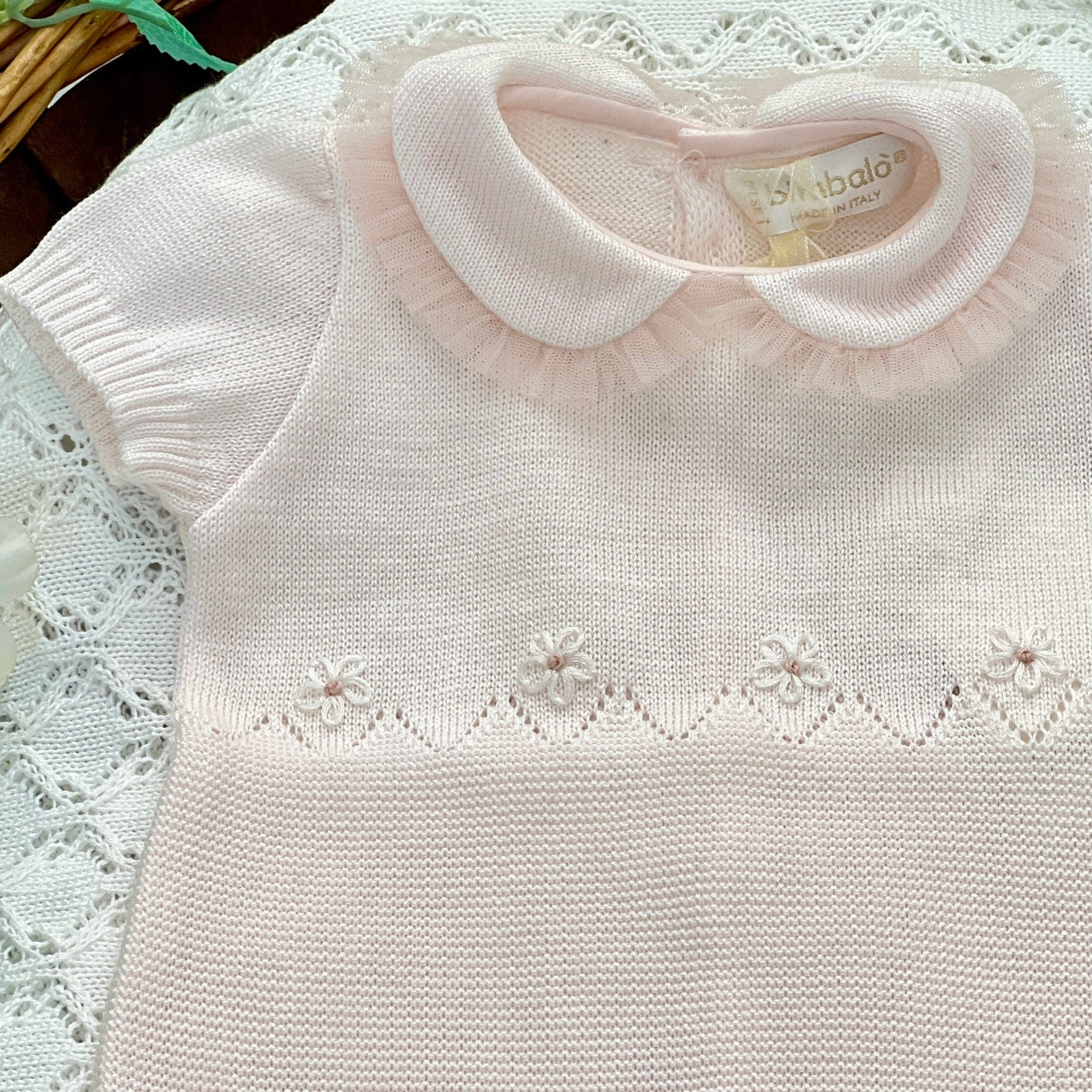 Pagliaccetto in filo di cotone 100%, con delicati trafori e fiori ricamati a mano. Il dettaglio in tulle sul colletto aggiunge un tocco di eleganza. Prodotto Made in Italy, realizzato con materiali di alta qualità.