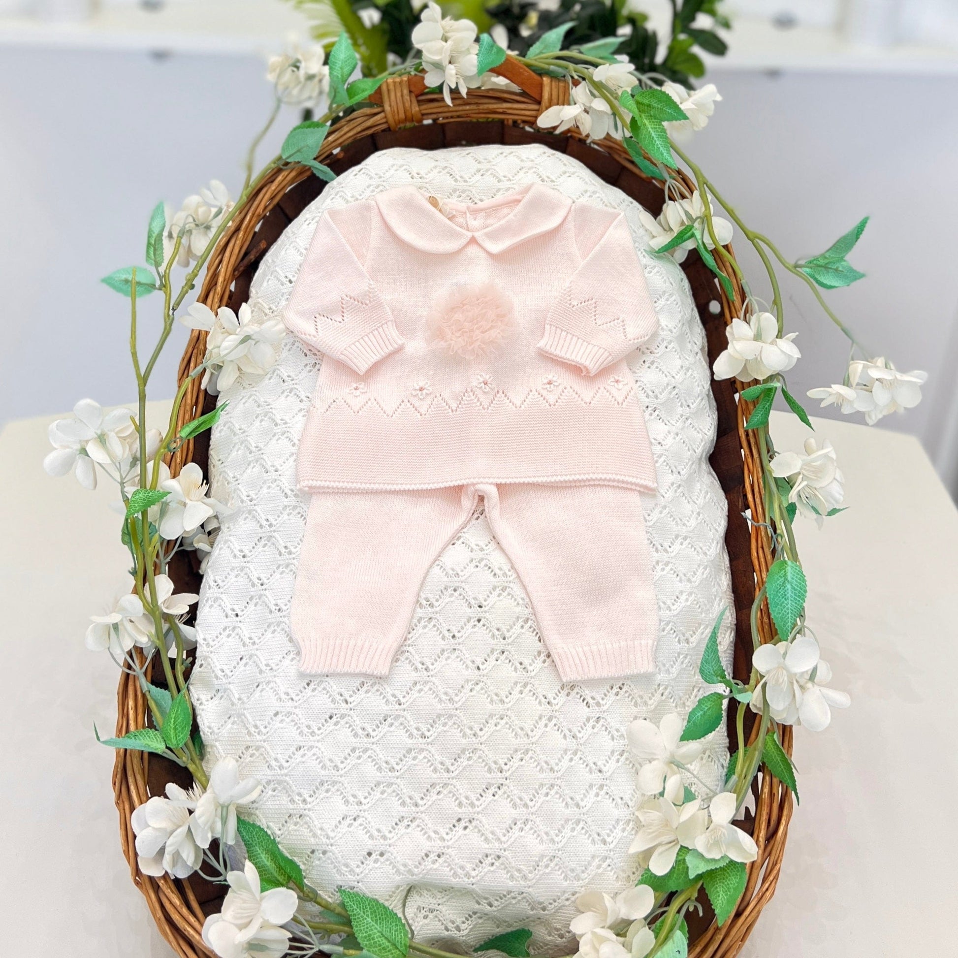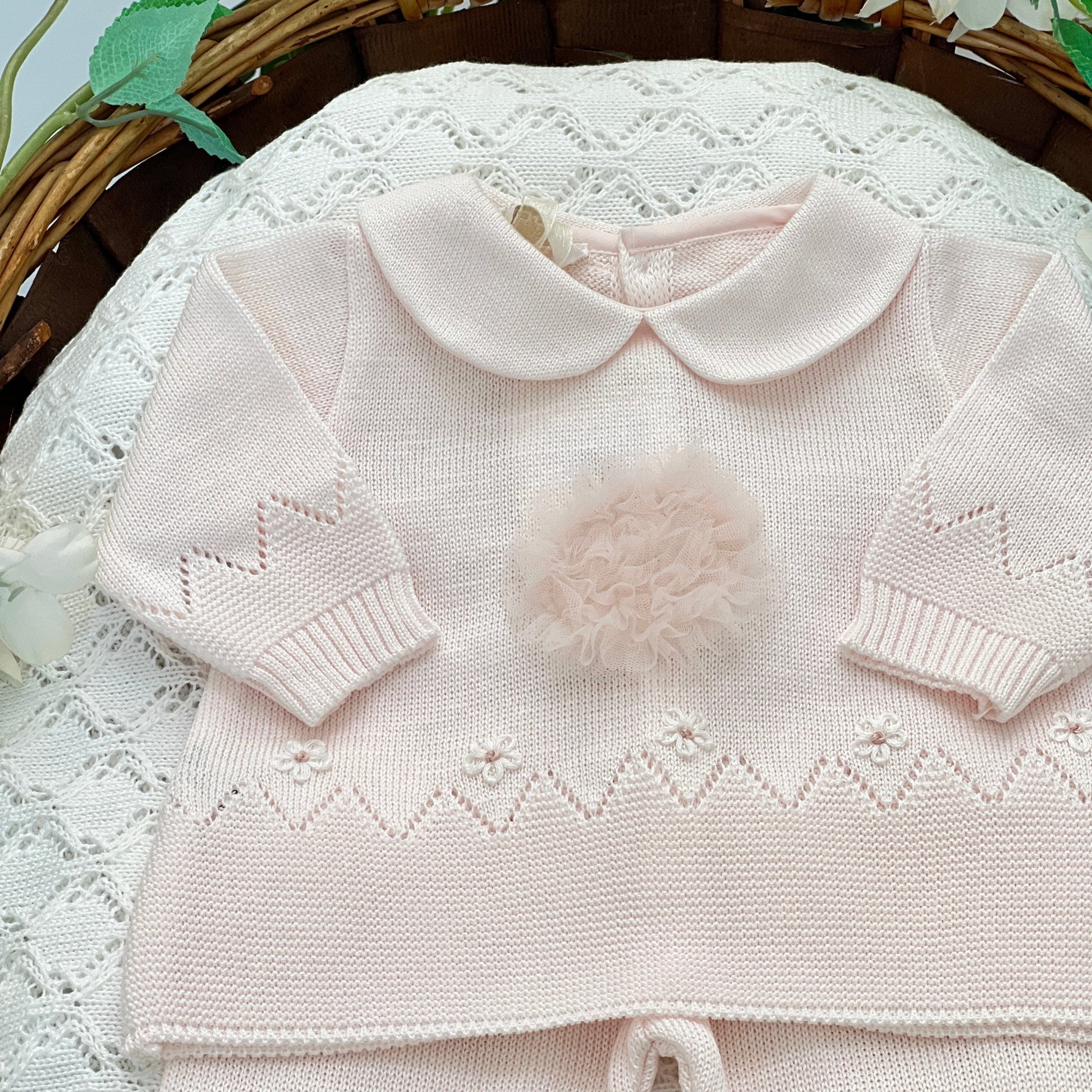 Tutina per neonata in filo di cotone top quality, con maglia arricchita da un elegante dettaglio in tulle. Un capo delicato, raffinato e realizzato con materiali di alta qualità, ideale per le prime occasioni speciali.