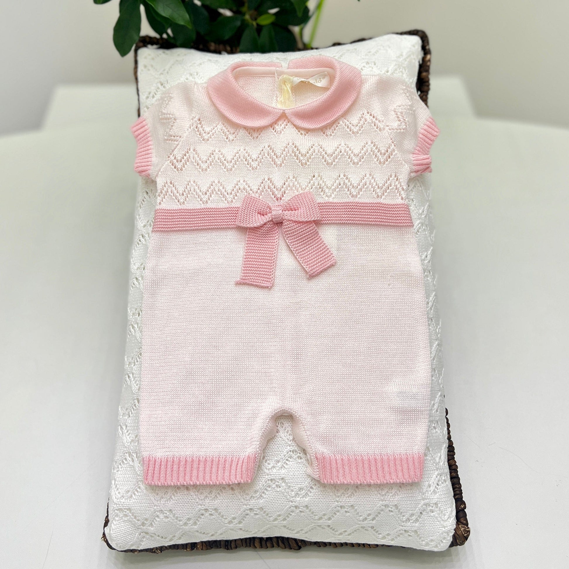 Tutina in filo di cotone nei toni del rosa chiaro, impreziosita da bordi in rosa più scuro. Design traforato con maniche corte e un delicato fiocco in vita. Ricamata interamente a mano, perfetta per un tocco elegante e di qualità.