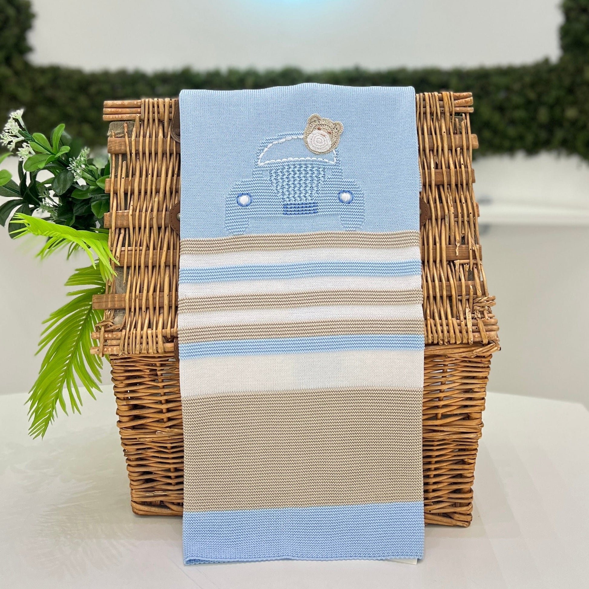 Coperta in filo di cotone nei toni celeste, beige e bianco, ricamata a mano con cura. Decorata con un dolce orsetto ricamato, è perfetta per un tocco di tenerezza e qualità artigianale.