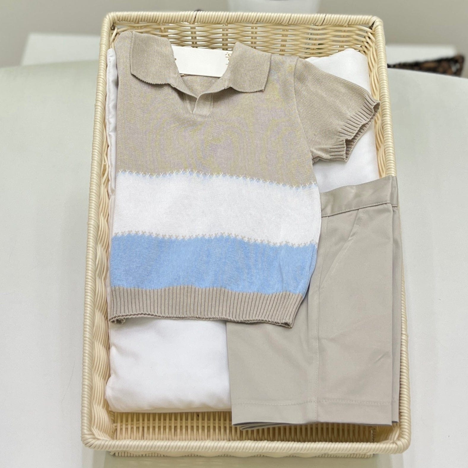 Completo estivo per bimbo, elegante e fresco, composto da una polo in filo di Scozia a righe beige, bianco e blu, con finiture curate e tessuto traspirante di altissima qualità. Il bermuda è realizzato in cotone effetto rasatello, un tessuto liscio e leggero con una mano setosa, ideale per affrontare le giornate estive con stile e comfort. Un look casual-chic perfetto per ogni occasione