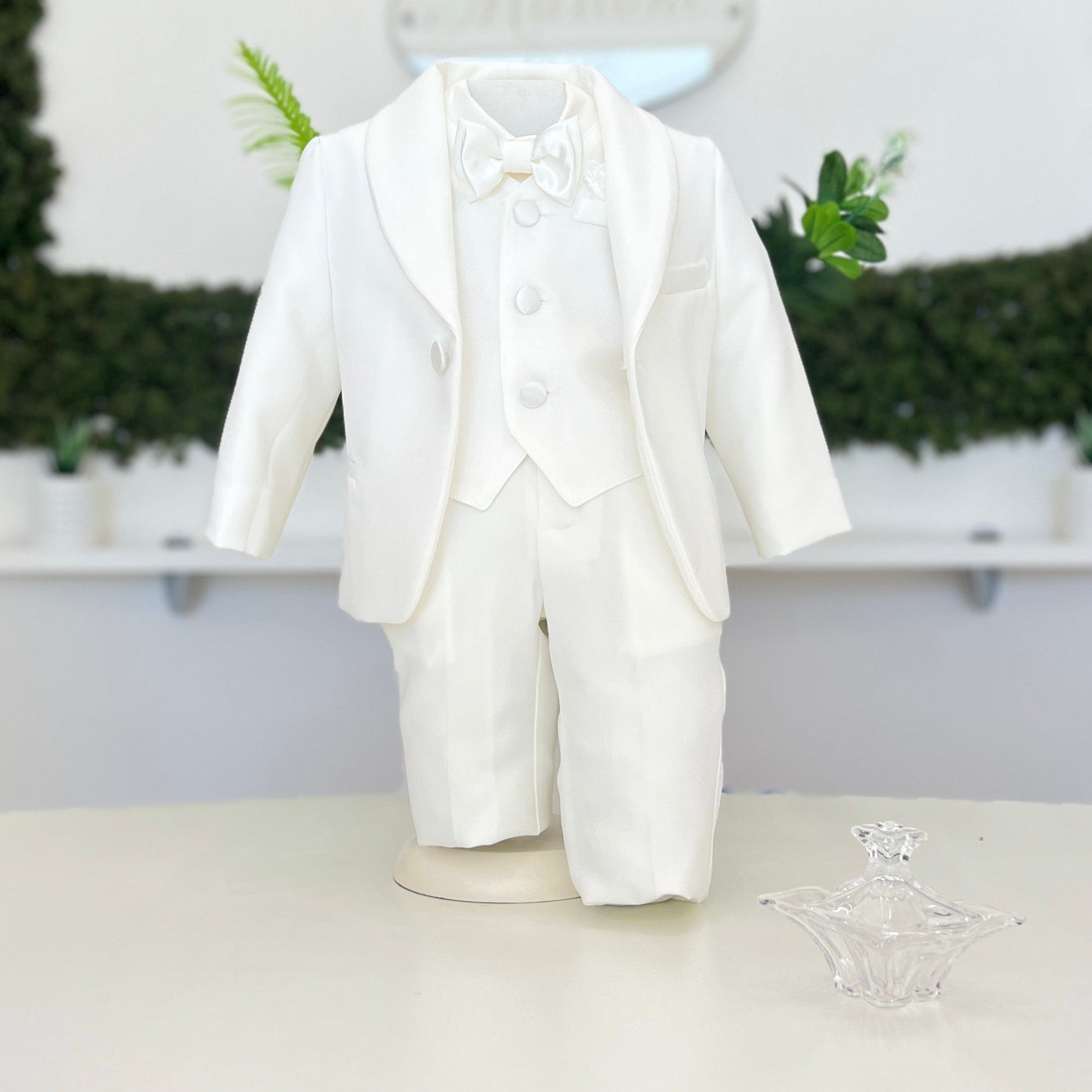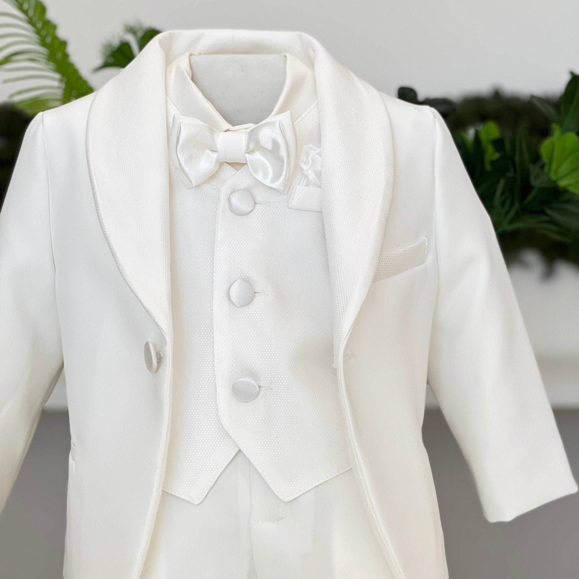 Abito battesimale neonato total white, composto da giacca monopetto effetto seta con profili e revers in nido d’ape lucido, gilet coordinato in nido d’ape, pantalone effetto seta con profilo laterale lucido, camicia e papillon. Un completo elegante e ricercato, pensato per rendere unico il giorno del battesimo.