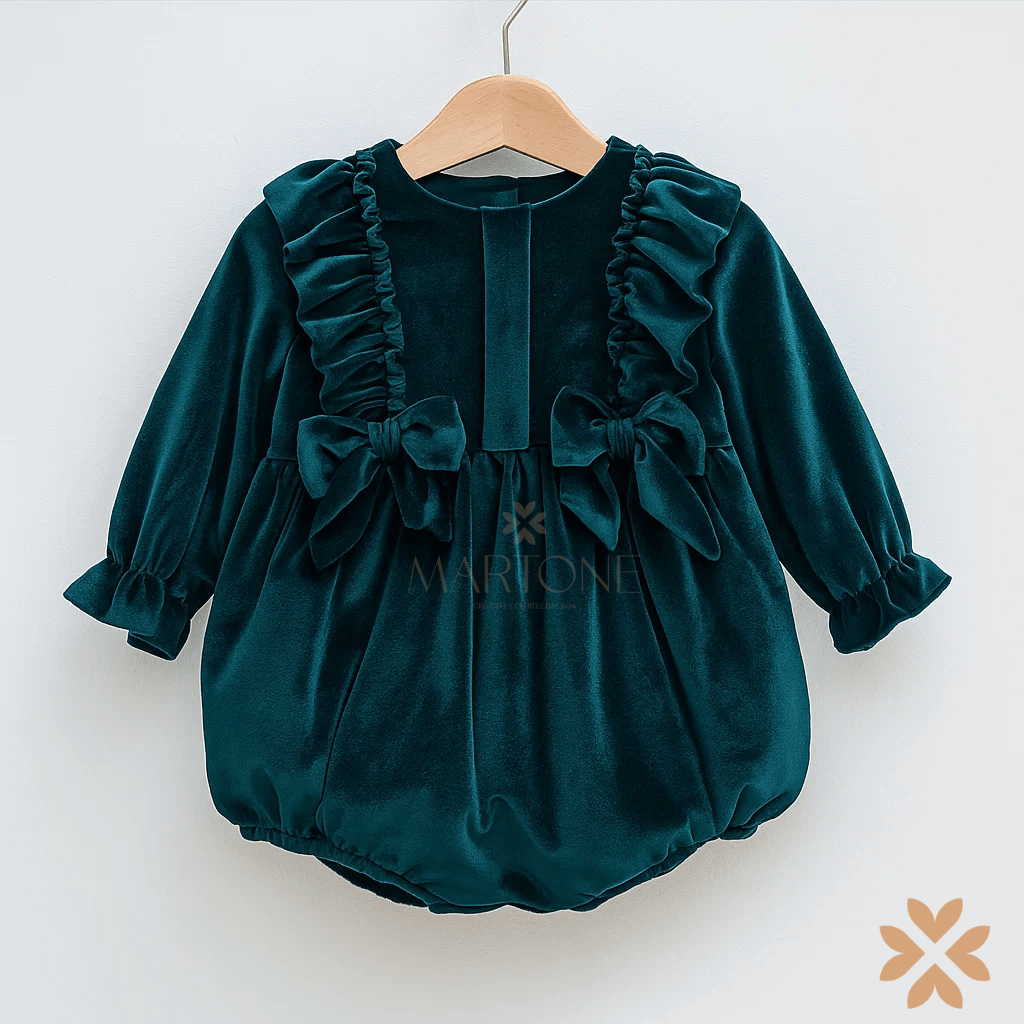 Pagliaccetto in velluto verde con volant e fiocchi applicati sul davanti. Il modello presenta maniche lunghe con polsino arricciato e dettagli arruffati che incorniciano il corpino, donando volume e dolcezza al design. I fiocchi in velluto tono su tono completano il capo con un tocco raffinato. Chiusura posteriore con bottoni e apertura inferiore con automatici per un cambio pratico. Un capo elegante e confortevole, ideale per le festività natalizie e le prime occasioni speciali.