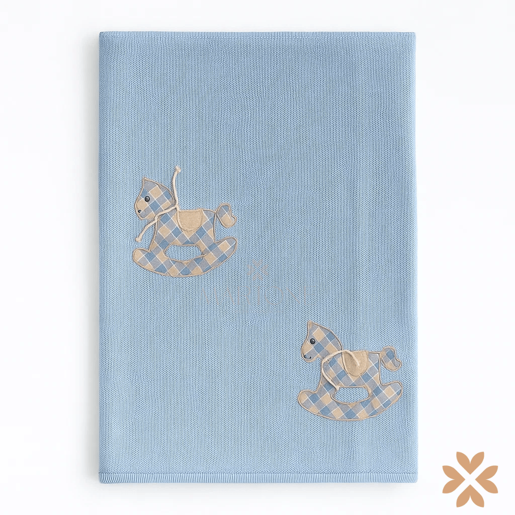 Copertina in maglia azzurra con applicazioni in tessuto vichy a motivo cavalluccio e orsetto. Realizzata in morbido cotone, dona comfort e dolcezza al neonato fin dai primi giorni.