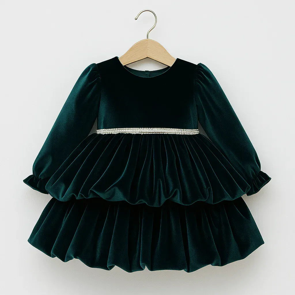 Abito in velluto verde smeraldo con doppia balza a palloncino. Il corpino è realizzato in velluto liscio con maniche lunghe leggermente arricciate sulle spalle, mentre la gonna presenta un design a due balze volumetriche che conferiscono un effetto strutturato e raffinato. Il punto vita è impreziosito da una sottile passamaneria con perle, che aggiunge luce e dettaglio al modello. Chiusura posteriore con zip invisibile. Un capo elegante e sofisticato, ideale per le festività natalizie e le occasioni speciali.
