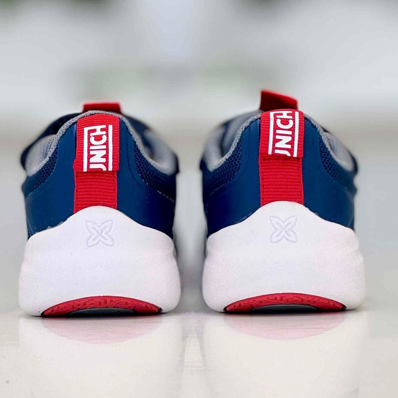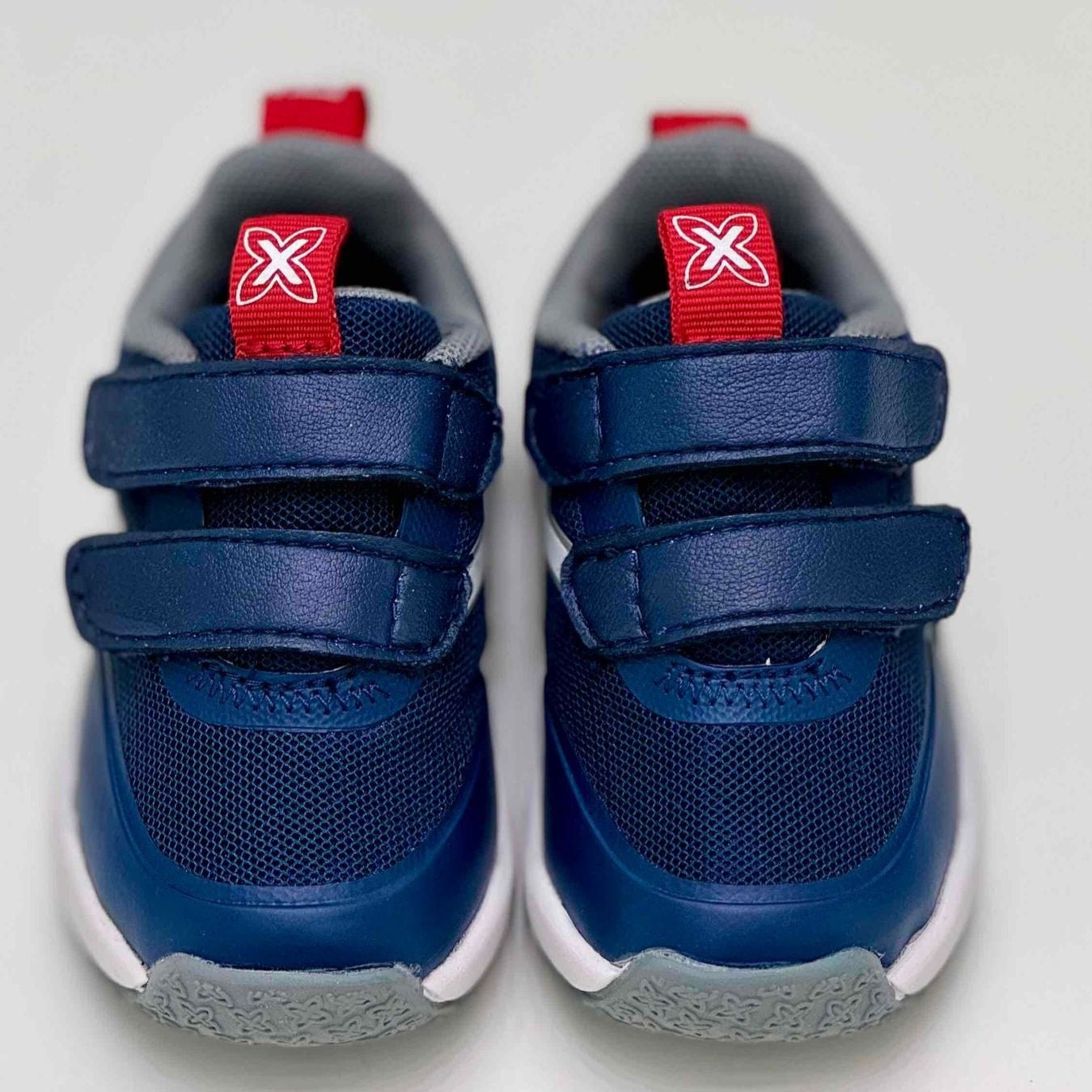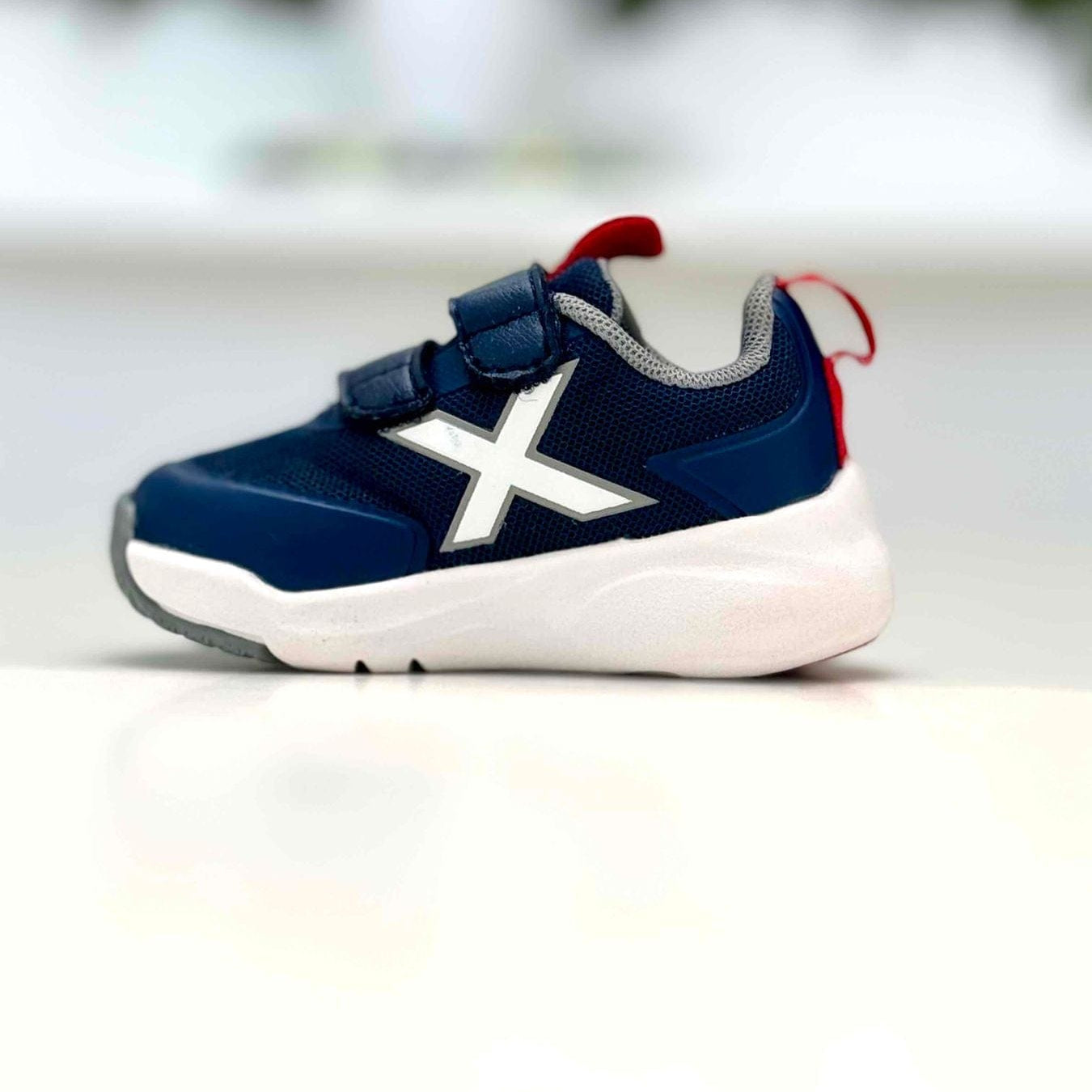 sneakers con fondo alto bianco, pelle e tela blu con strappo e logo laterale