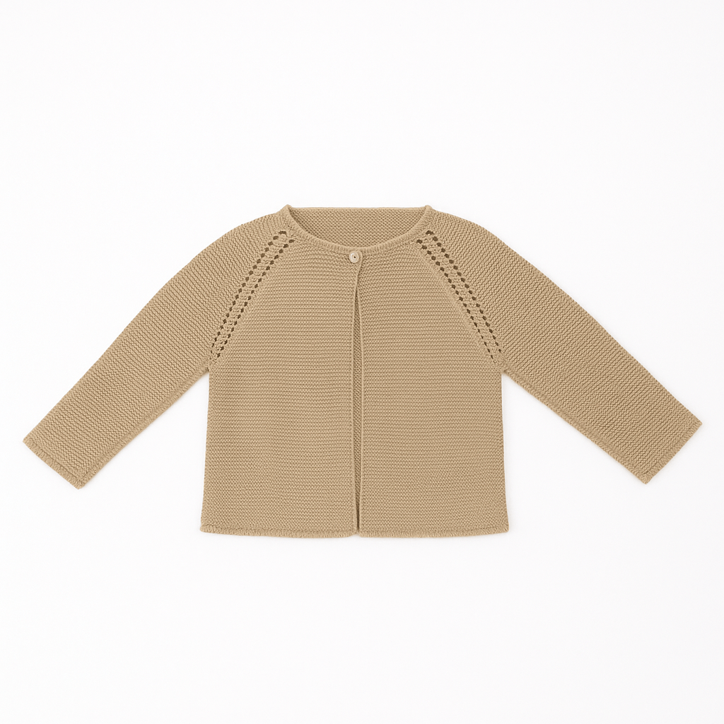 Cardigan in tricot a maniche lunghe, realizzato con una lavorazione a punto riso che dona struttura e morbidezza. Il design presenta apertura frontale con singolo bottone al collo e delicati dettagli traforati sulle maniche raglan. Un modello essenziale e raffinato, perfetto per completare con eleganza il guardaroba quotidiano.