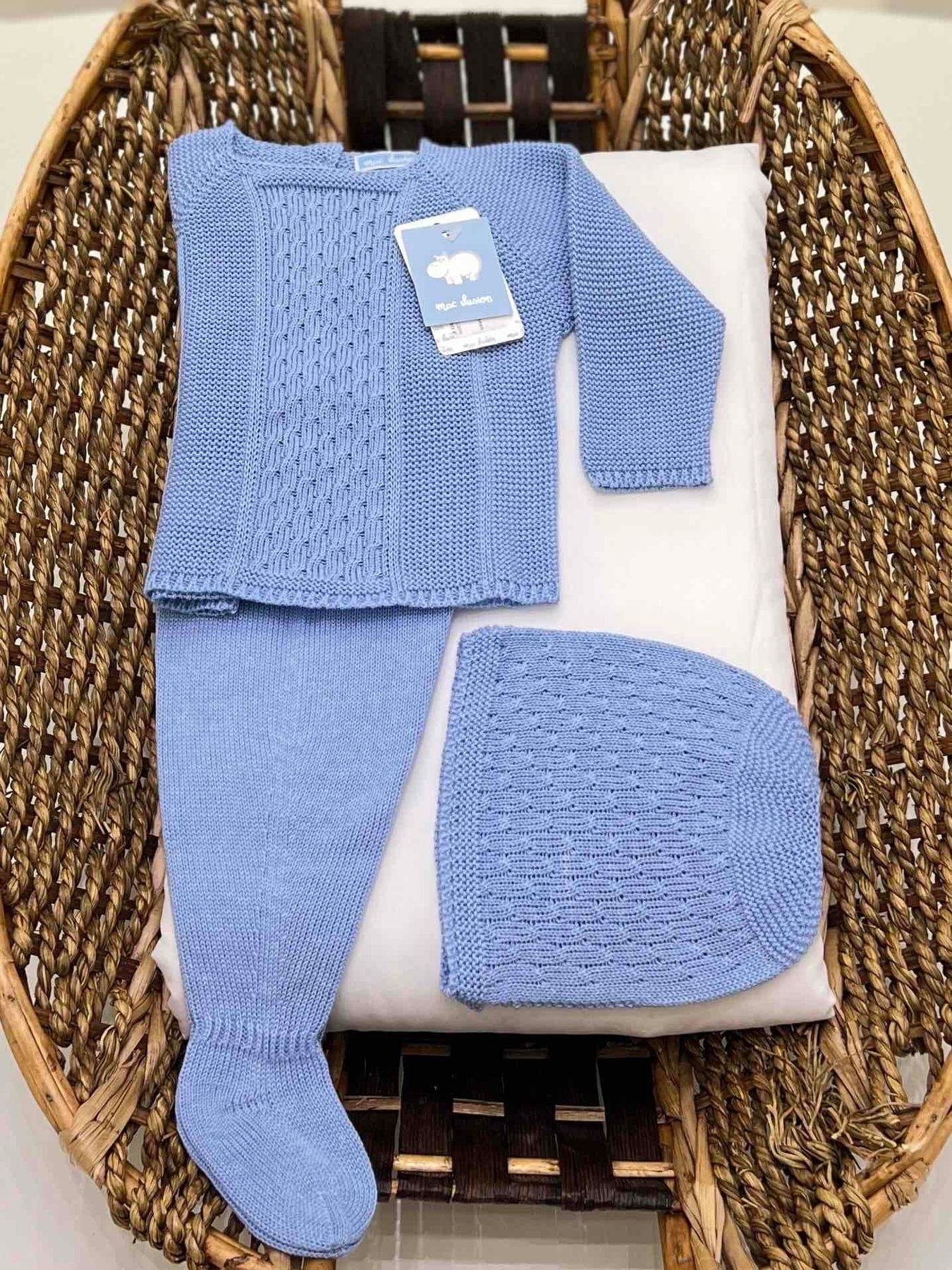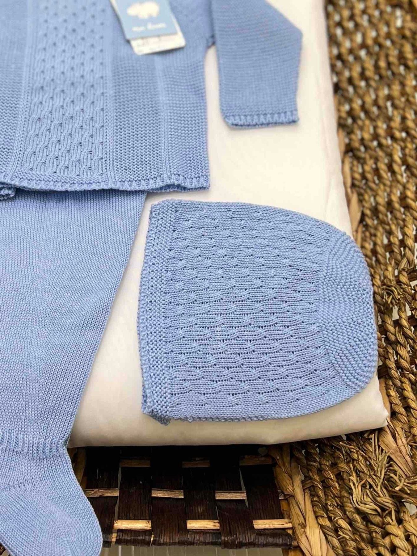 Completo nascita neonato tre pezzi con ghettine in filo di cotone e cappellino con trama ricamata.