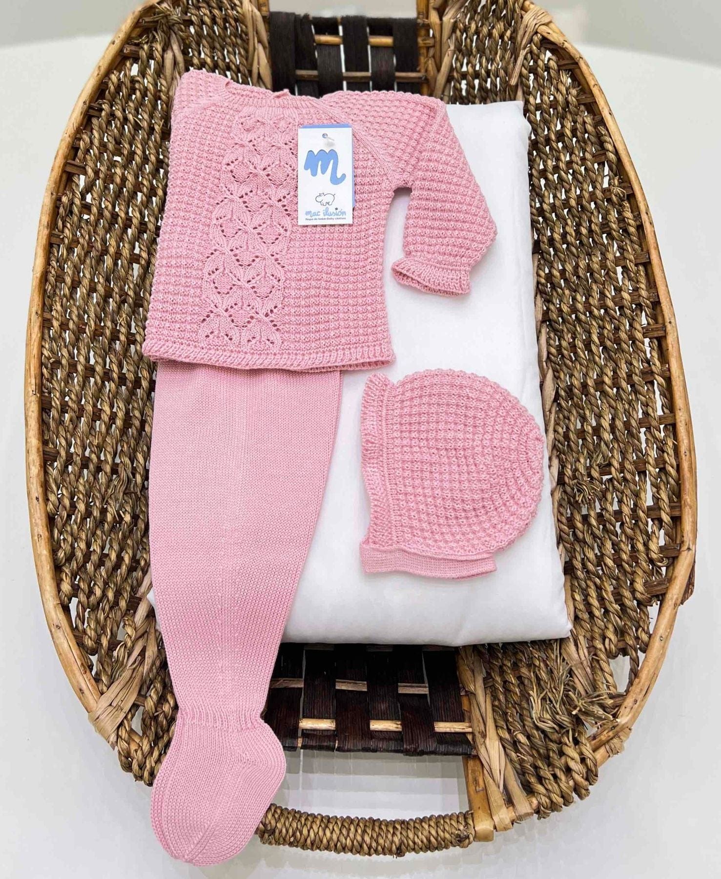 Completo nascita neonata tre pezzi con ghettine e cuffia in filo di cotone, con trama tono su tono ricamata.