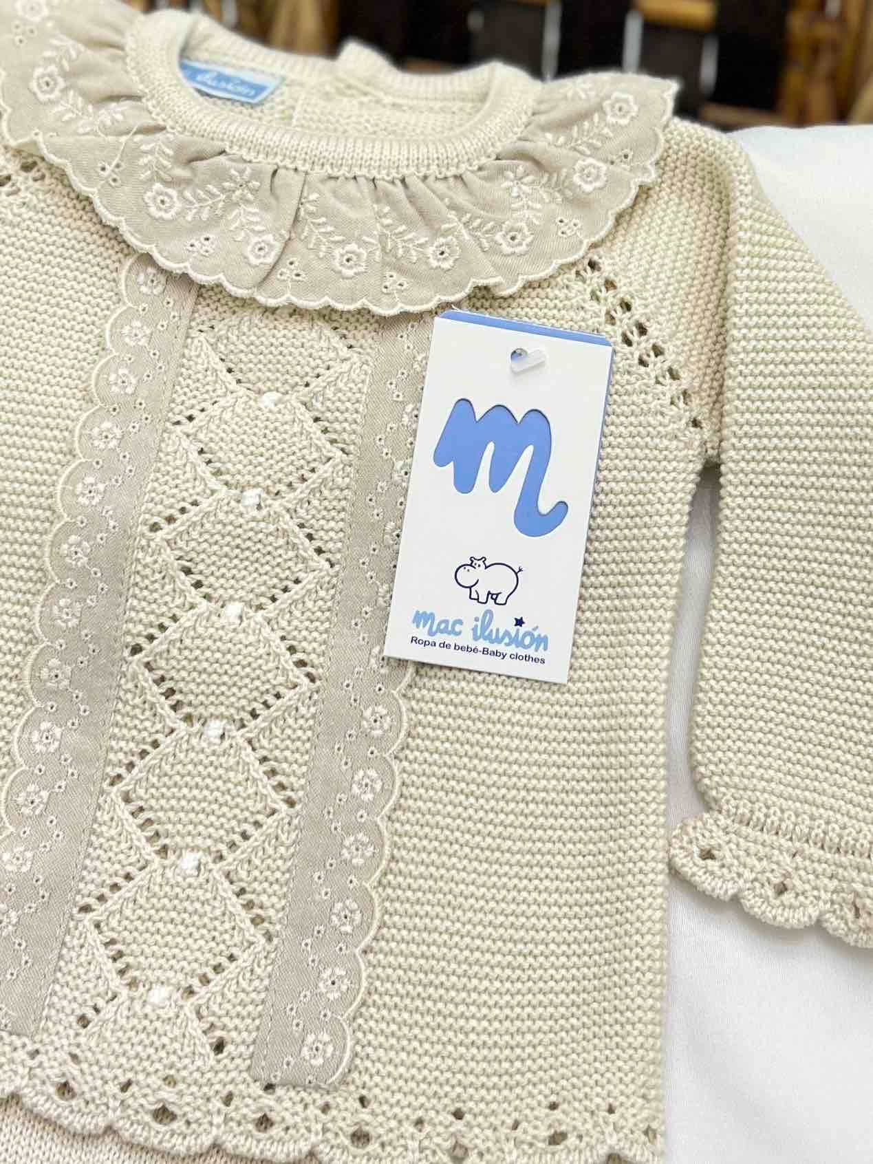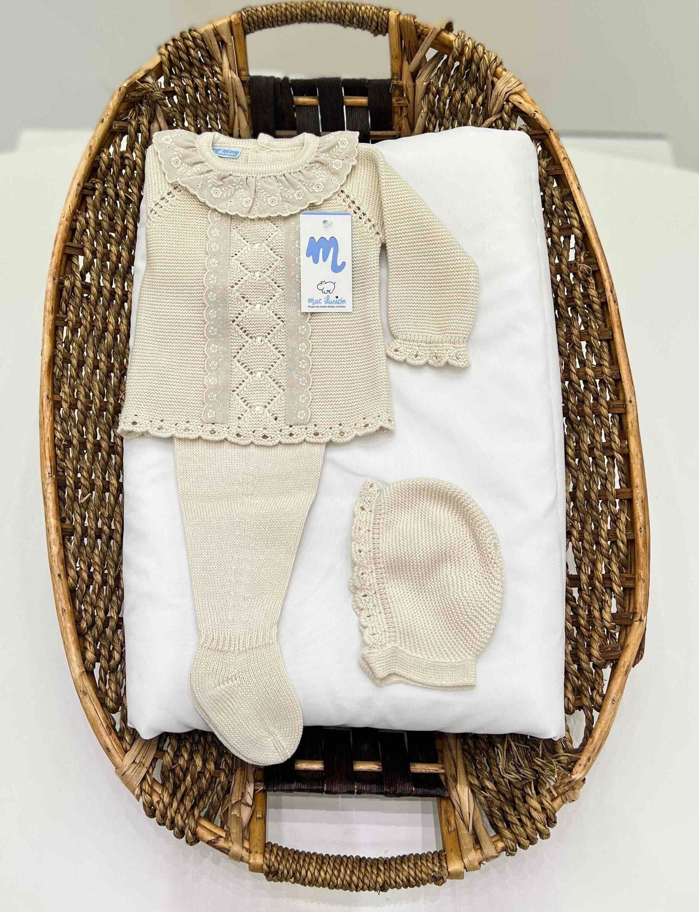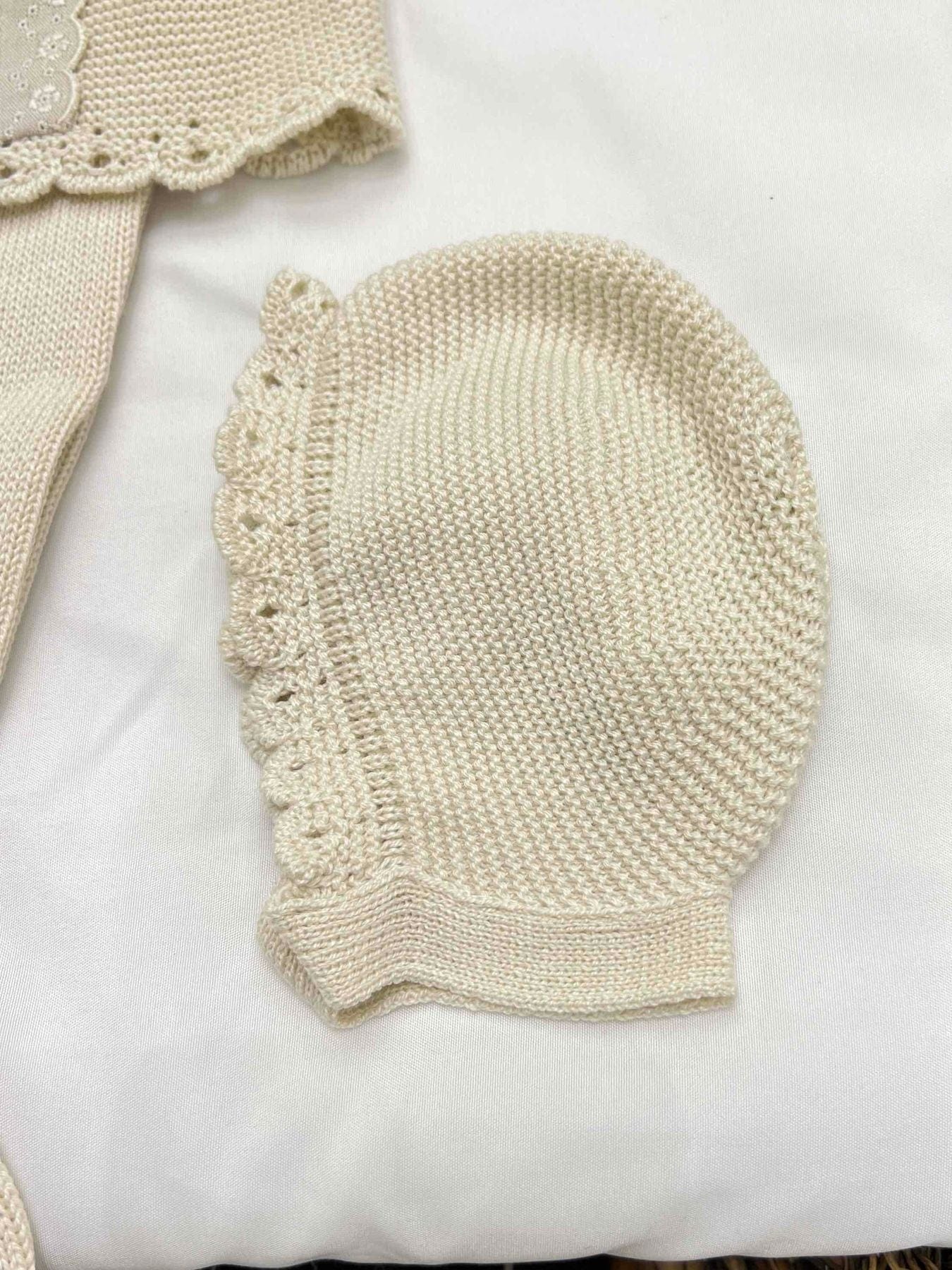Completo clinico neonata tre pezzi con ghettine e cuffia in filo di cotone con trama traforata e rouches ricamate sul collo e sul davanti.
