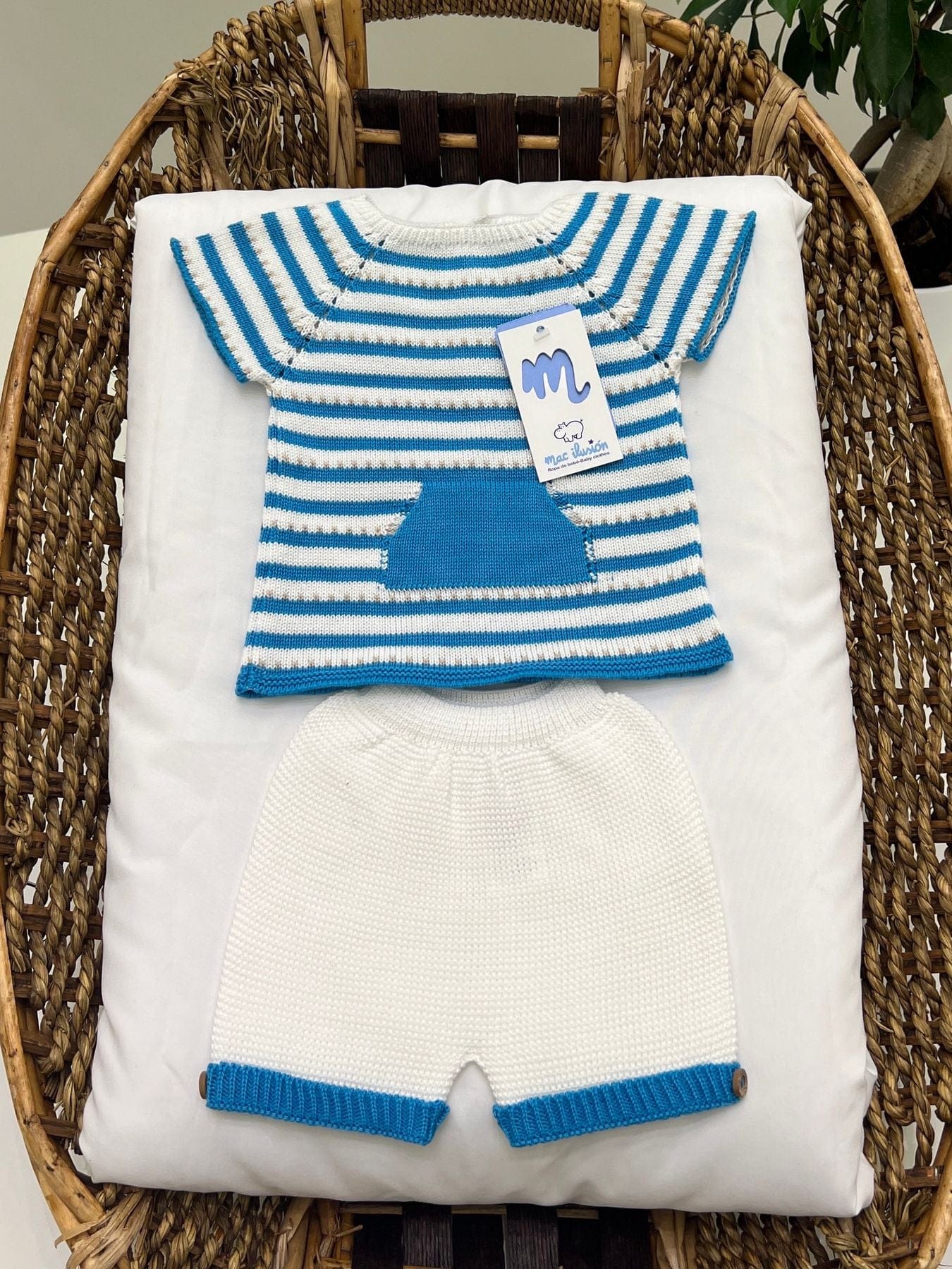 Completo due pezzi neonato in filo di cotone a manica corta e pantaloncino. Trama ricamata con fantasia a righe e tasca a marsupio.
