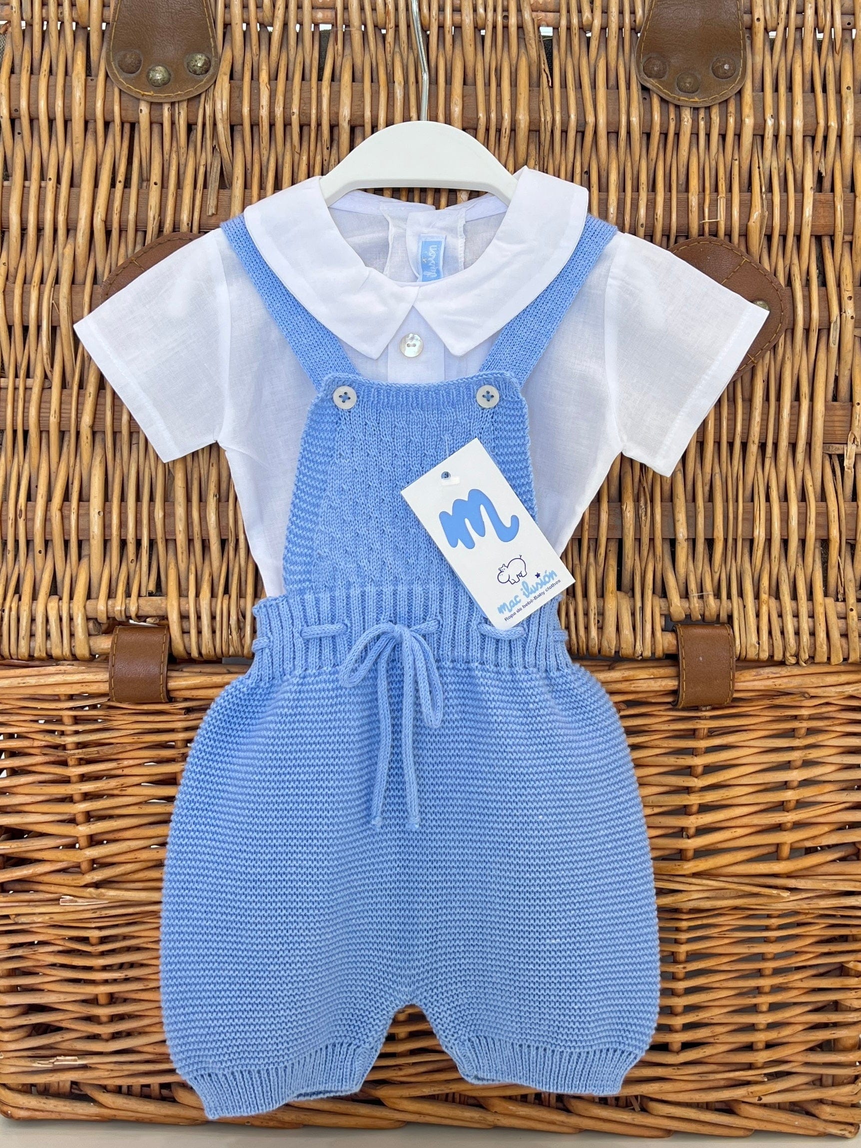 Salopette corta neonato in filo di cotone, con camicia in cotone manica corta.