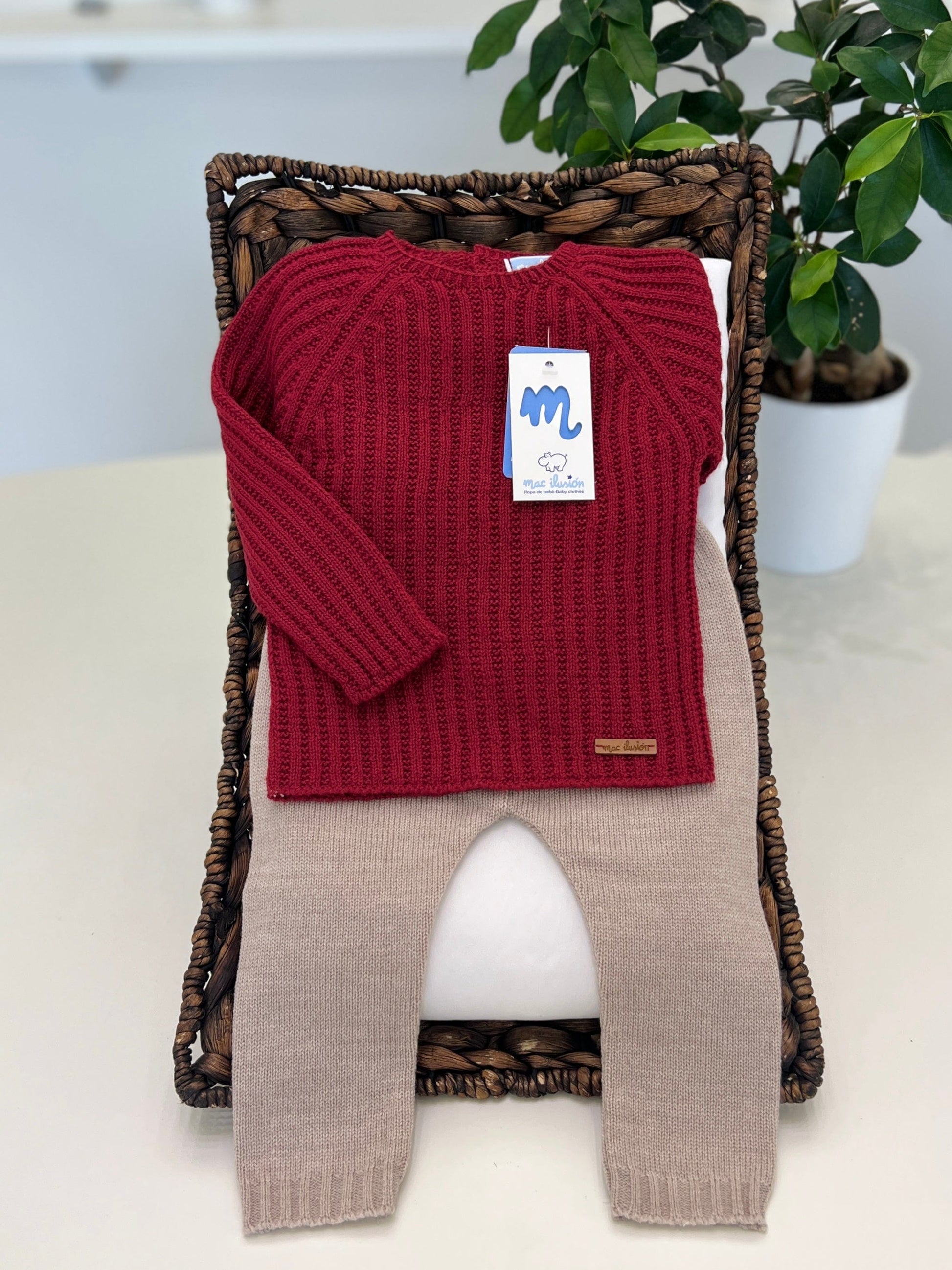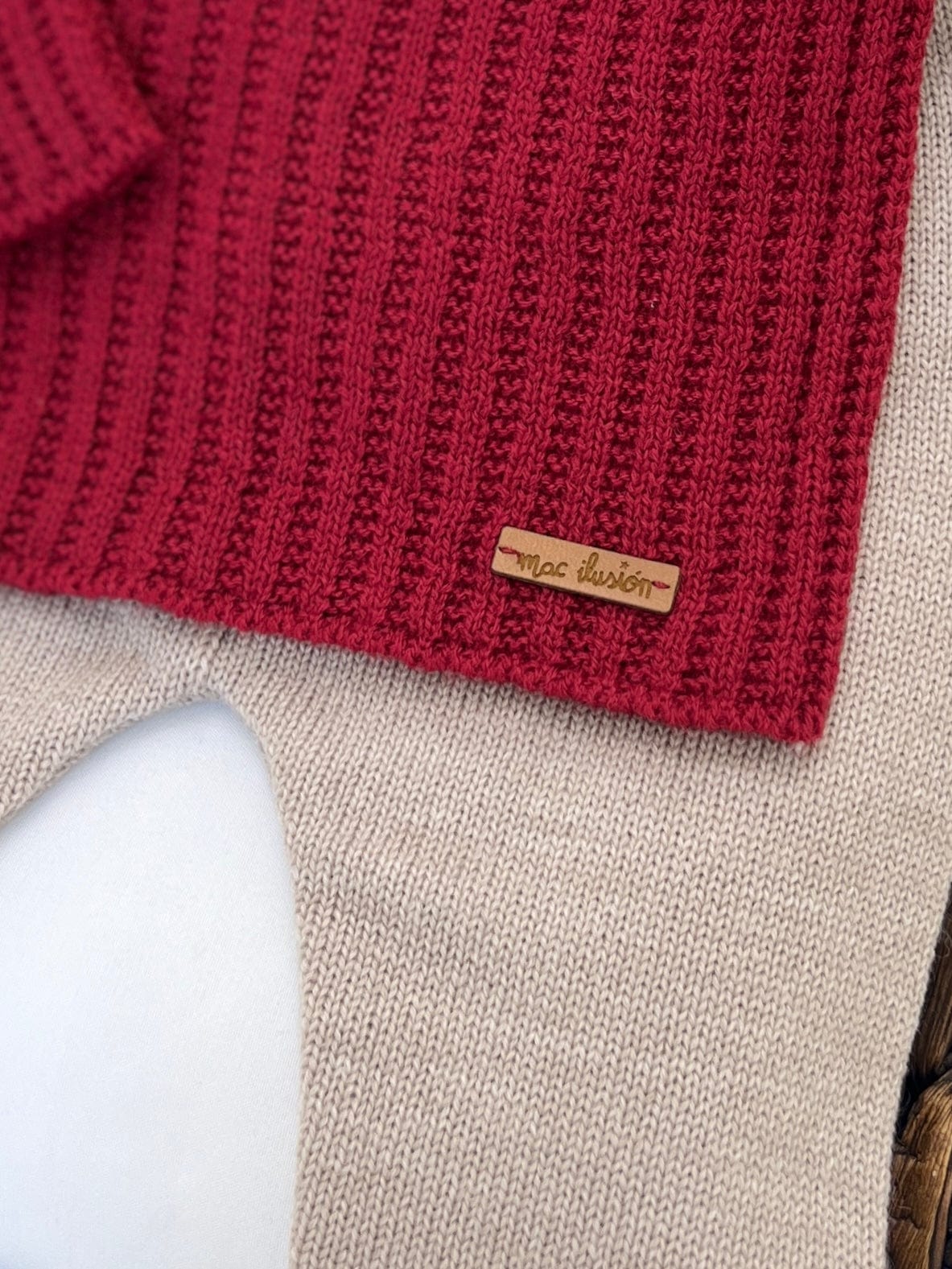 Questo completo due pezzi per bimbo è realizzato in un caldo misto lana, perfetto per le giornate fresche. Il maglione di un rosso intenso presenta un design classico e accogliente, con una lavorazione a maglia che garantisce morbidezza e comfort. I pantaloni écru , anch'essi in misto lana, sono dotati di lacci regolabili in vita per una vestibilità personalizzata e sicura. Questo completo combina praticità e stile, assicurando al tuo bimbo un look elegante e un comfort ottimale. Adatto anche per chi cerca un completo natalizio sobrio ma a tema.