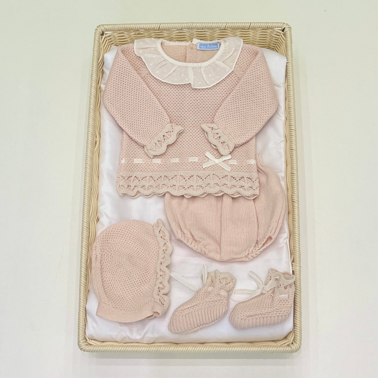 Completo quattro pezzi composto da maglia in misto lana con rouches e smerlo, culotte, cuffia e babbucce coordinate.