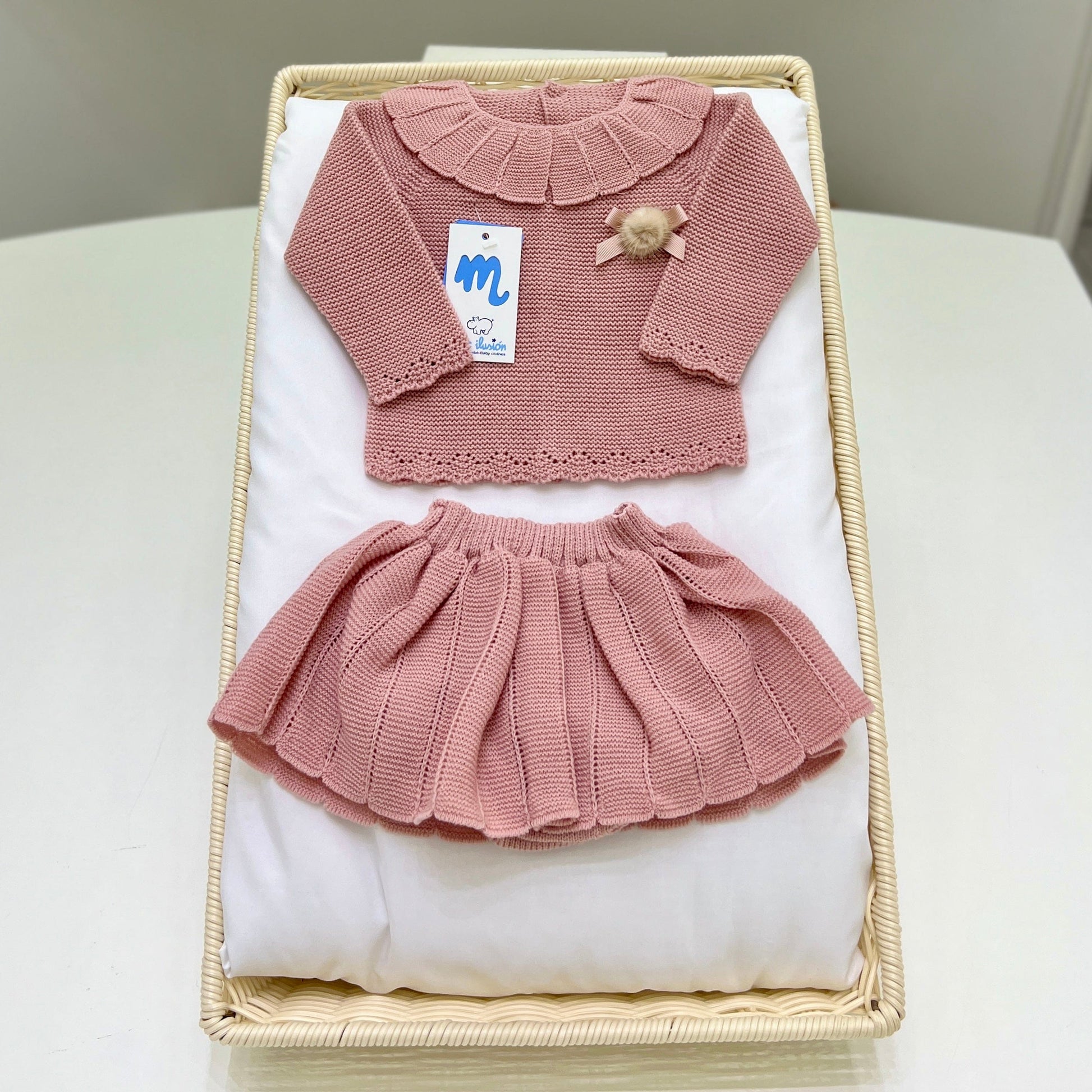 Completo due pezzi in misto lana, maglia con rouches sul collo e pompon e culotte con balza con trafori.