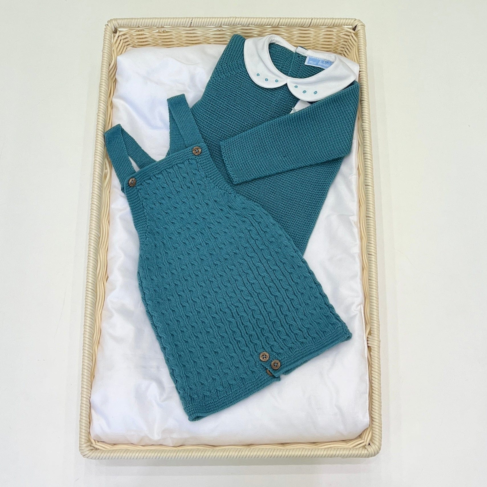 Salopette in misto lana a trecce, con maglia coordinata con colletto.