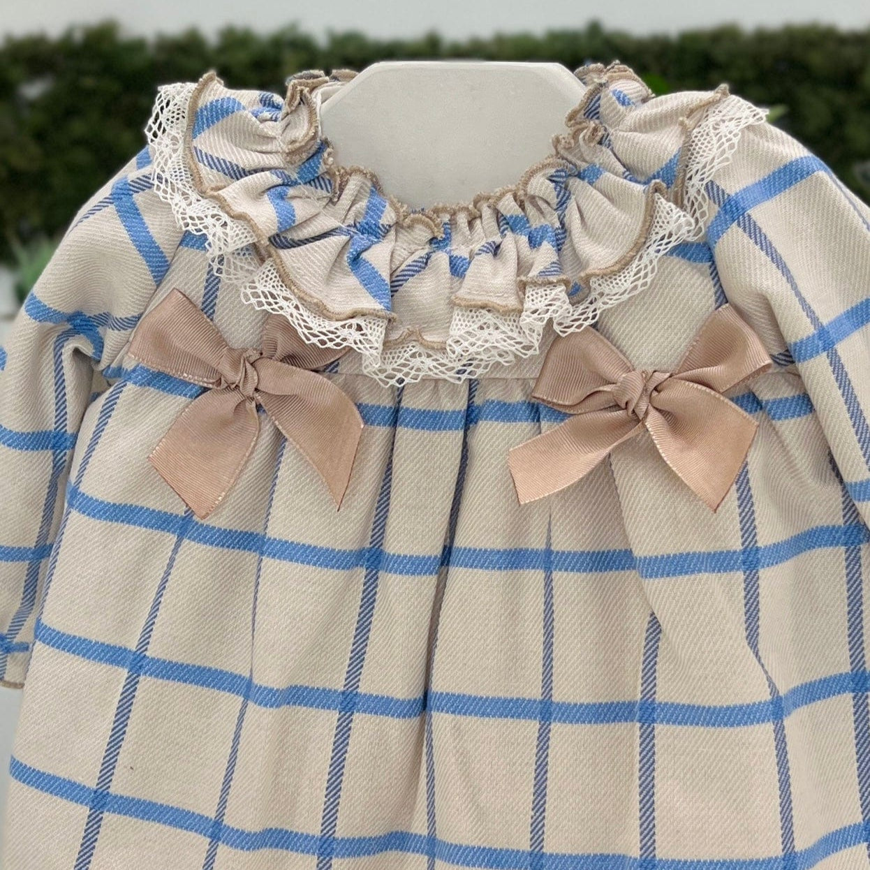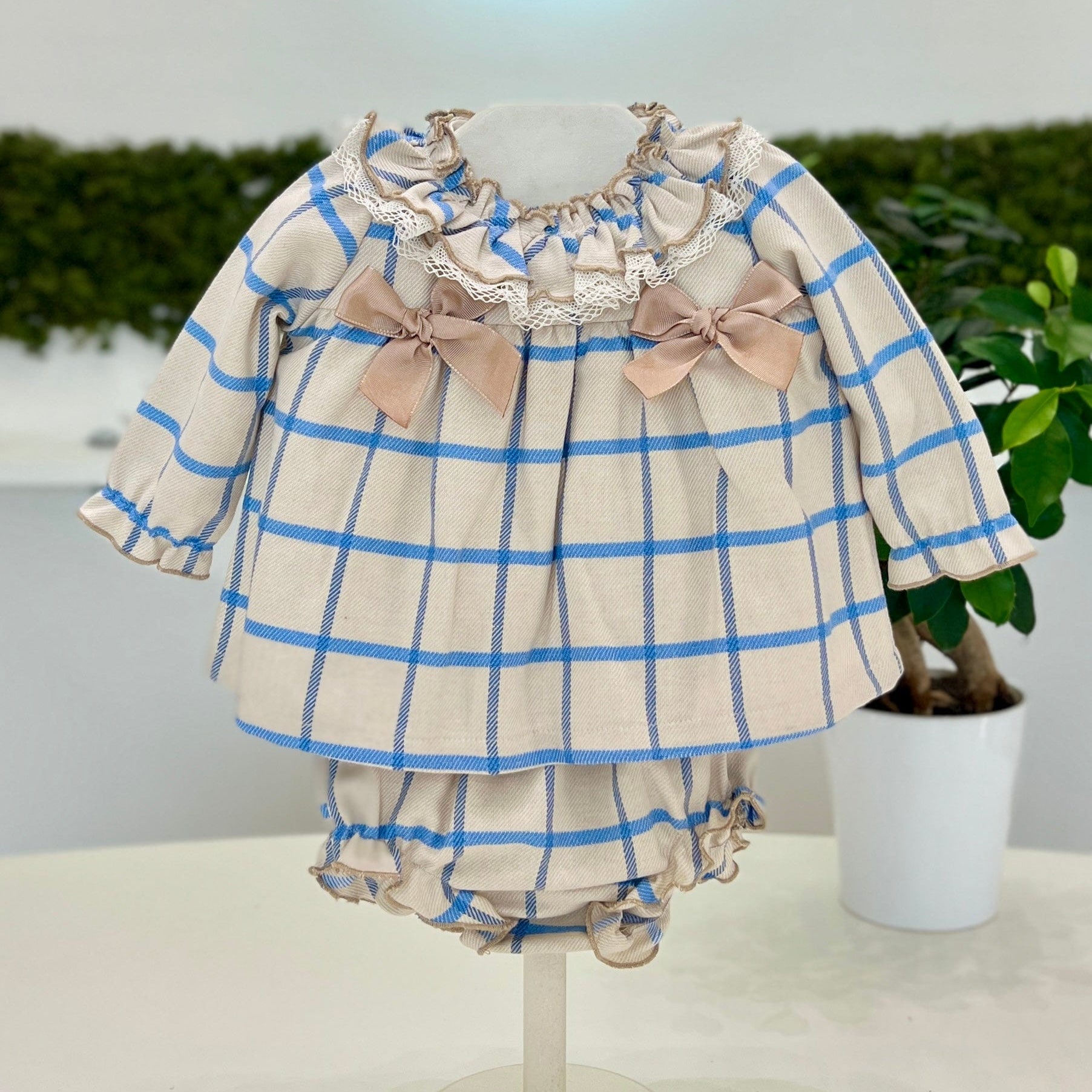 Completo per neonata composto da blusa e culotte copripannolino. La blusa, in fantasia a quadri nei toni del beige, panna e celeste, è arricchita da un colletto con rouches e una pratica abbottonatura sul retro. Il davanti è decorato con delicati fiocchetti, aggiungendo un tocco di eleganza. Le culotte copripannolino coordinate completano l'outfit, perfetto per un look raffinato e dolce.