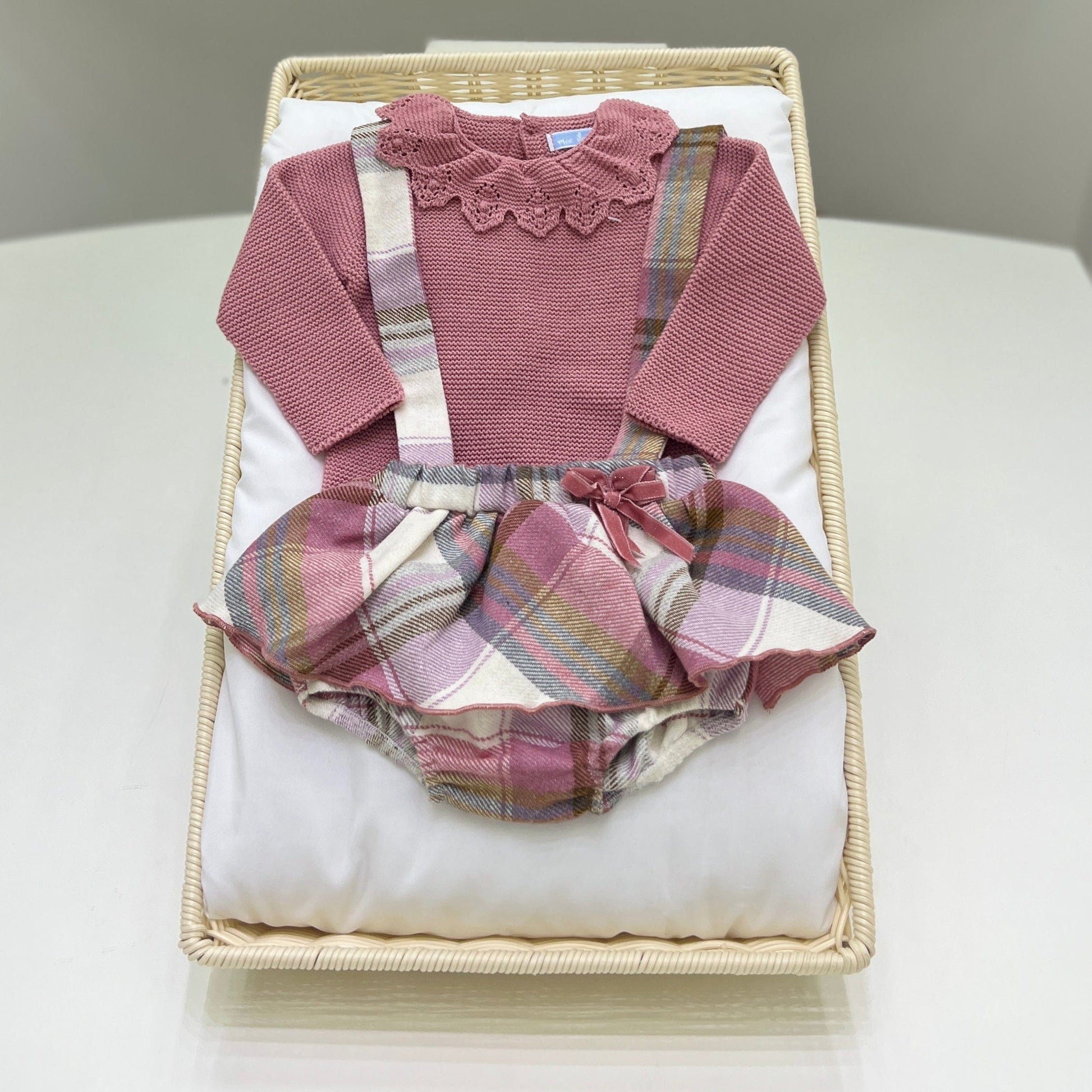 Completo due pezzi, salopette pagliaccetto in caldo cotone con balza fantasia scozzese, maglia in misto lana con trafori e rouches con smerlo.