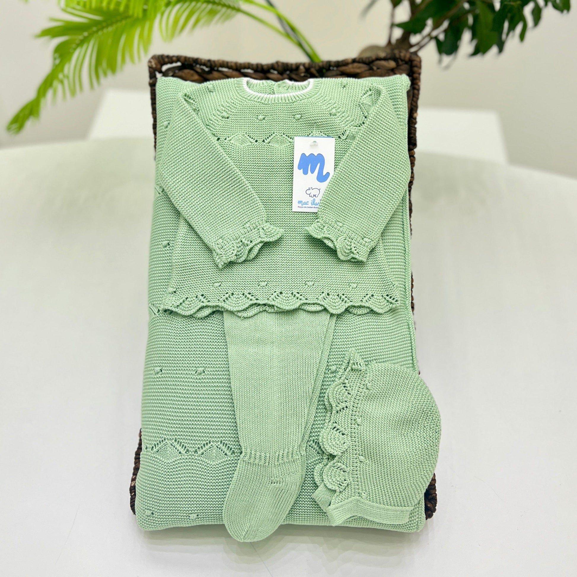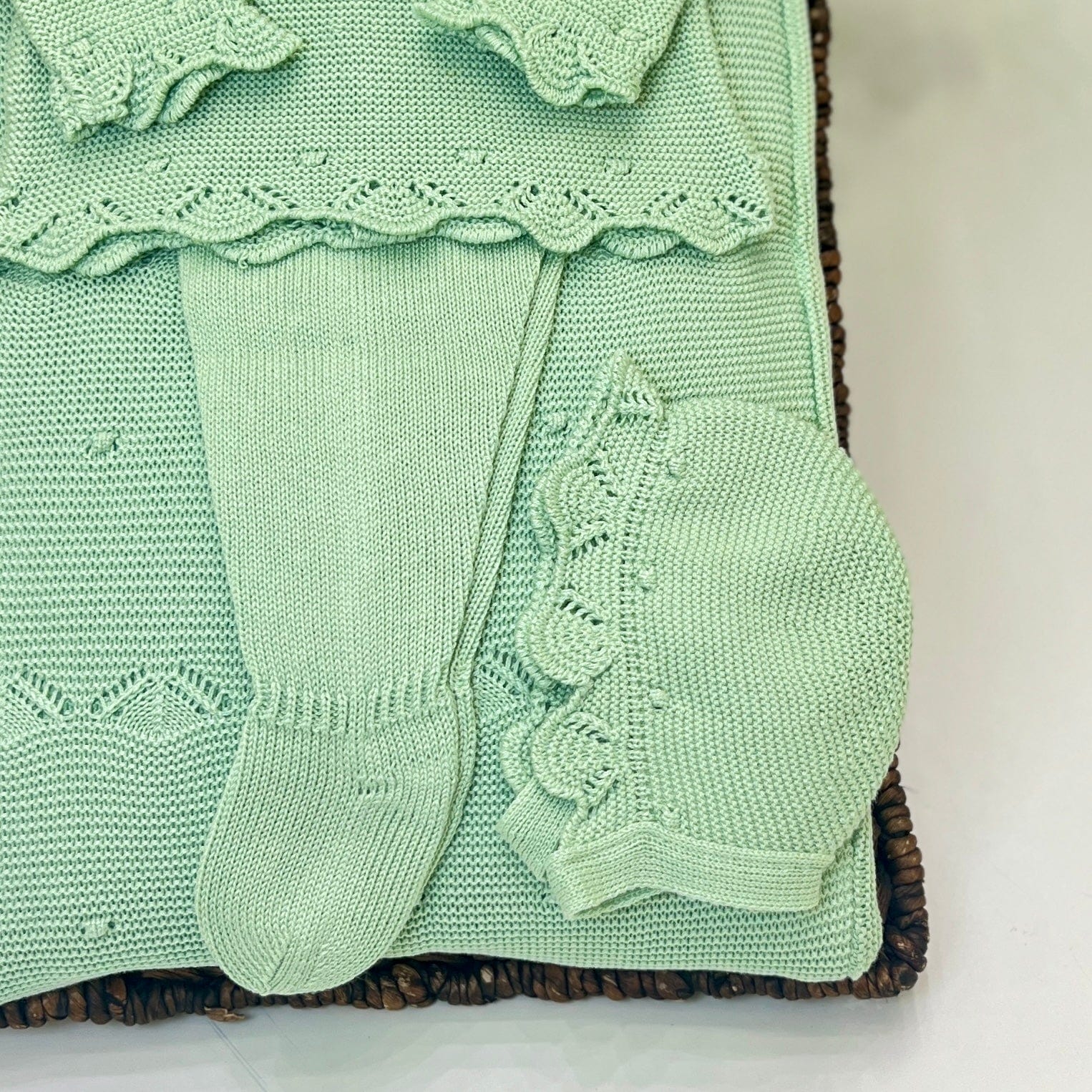 Elegante tutina spezzata per neonati, realizzata in pregiato filo di cotone e impreziosita da una raffinata lavorazione a nodini. Disponibile in un delicato verde pastello, include una cuffia coordinata per un look armonioso. La maglia presenta un’abbottonatura sul retro, pensata per garantire praticità e comfort assoluto. Perfetta per la pelle delicata dei più piccoli.