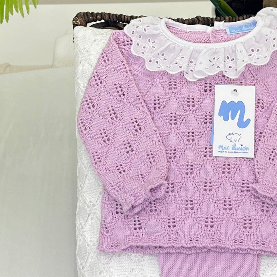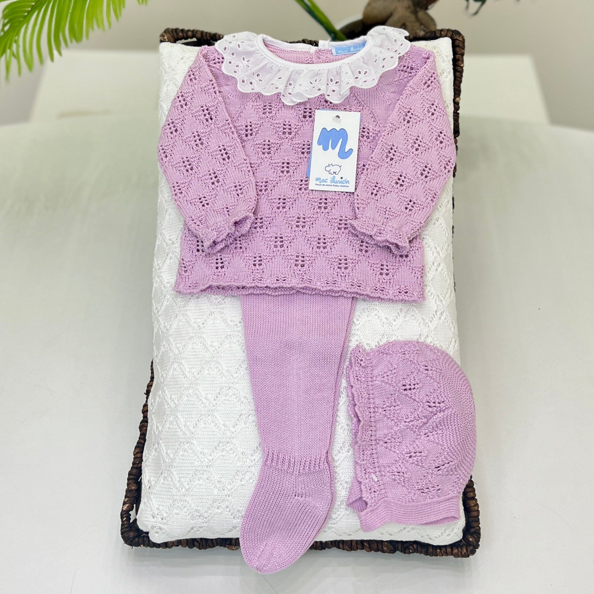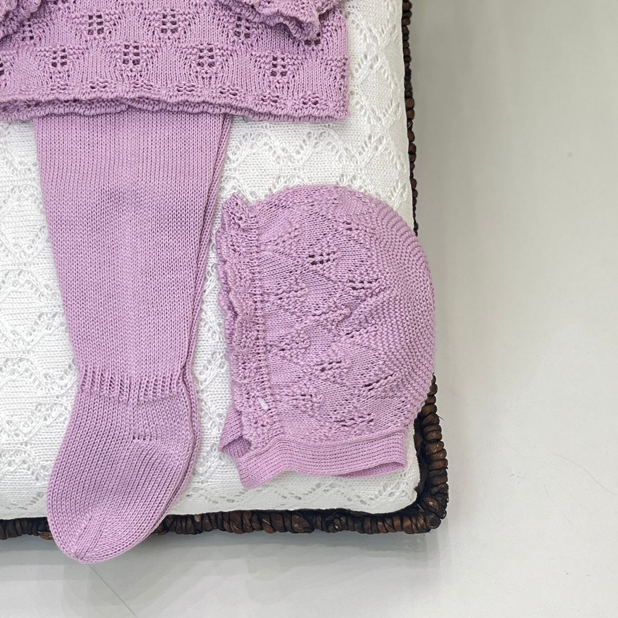 Tutina spezzata per neonata in morbido filo di cotone, impreziosita da una raffinata lavorazione traforata in rilievo. Completa di cuffia coordinata e colletto con delicate rouche in sangallo, combina eleganza e comfort per le occasioni più speciali.