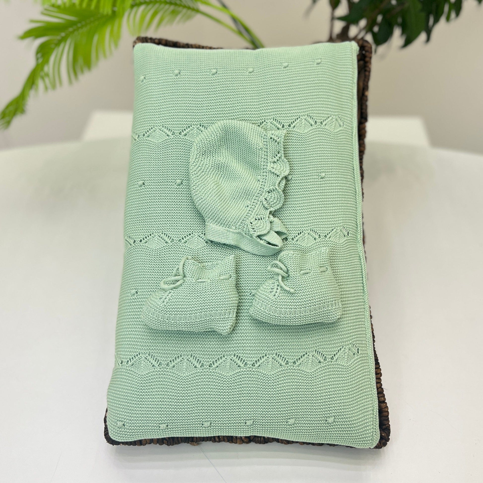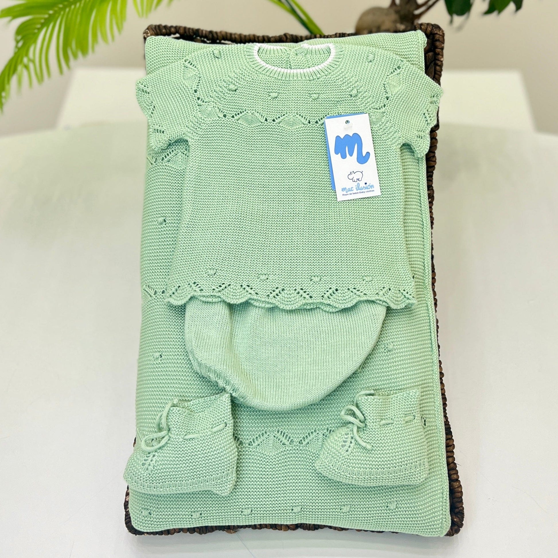 Completo 4 pezzi in morbido filo di cotone color verde pastello, composto da maglia, pantaloncini, cuffia e babbucce. La lavorazione traforata con delicati nodini ricamati aggiunge un tocco di eleganza e delicatezza, ideale per il comfort del tuo neonato
