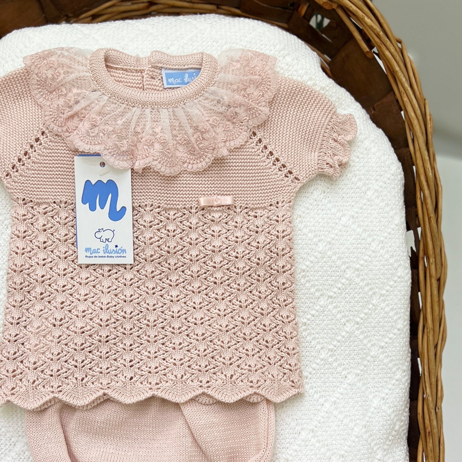 Completo corto per neonata in filo di cotone e pizzo, composto da maglia con colletto e rouches, culotte, babbucce e cuffia abbinate. Un insieme elegante e delicato, ideale per le occasioni speciali.