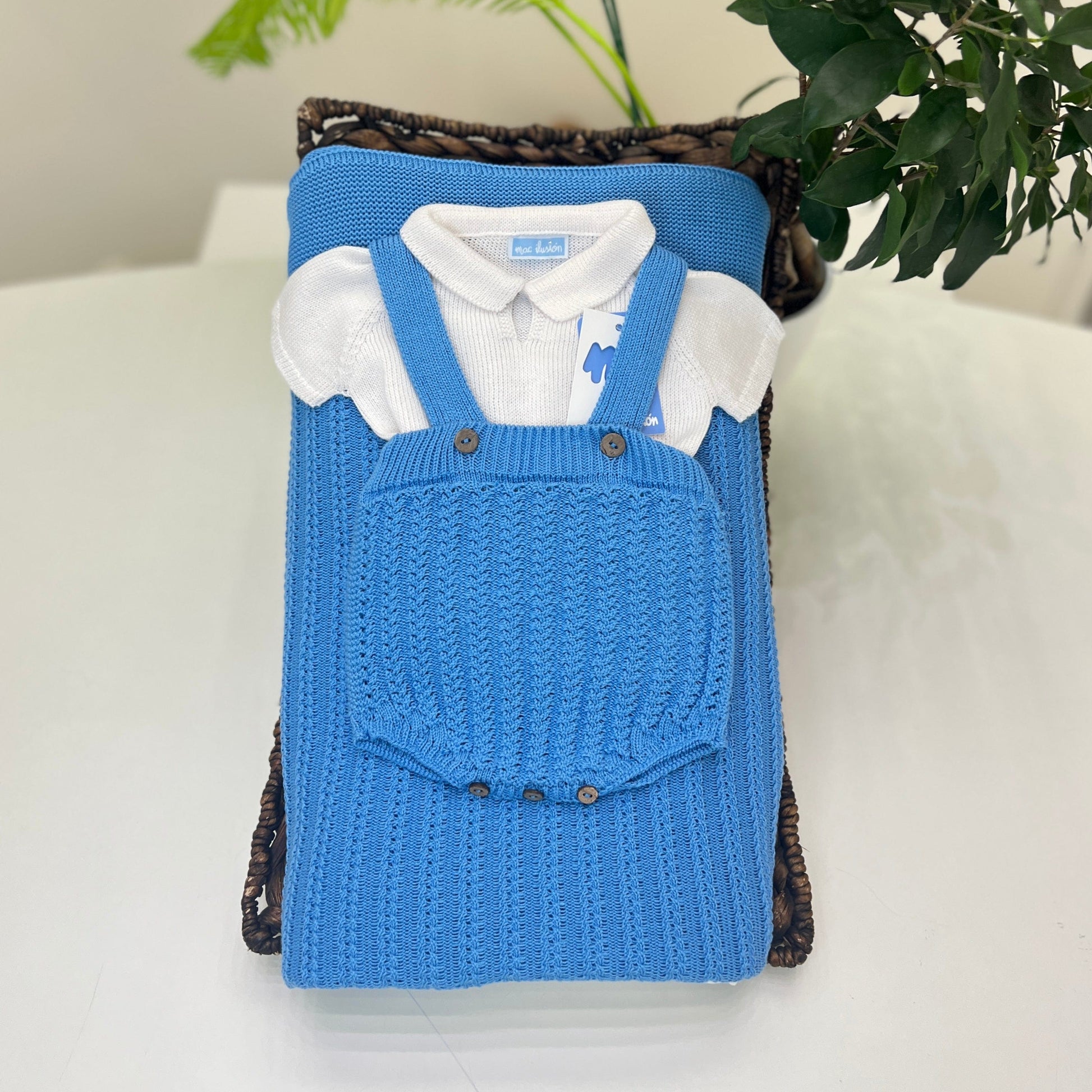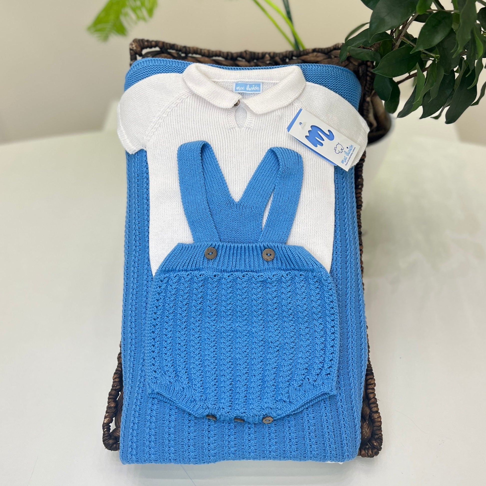 Completo per neonato in morbido filo di cotone, composto da una polo bianca e una salopette azzurra con bretelle e bottoncini. Un set semplice e raffinato, ideale per il comfort e lo stile del tuo piccolo.