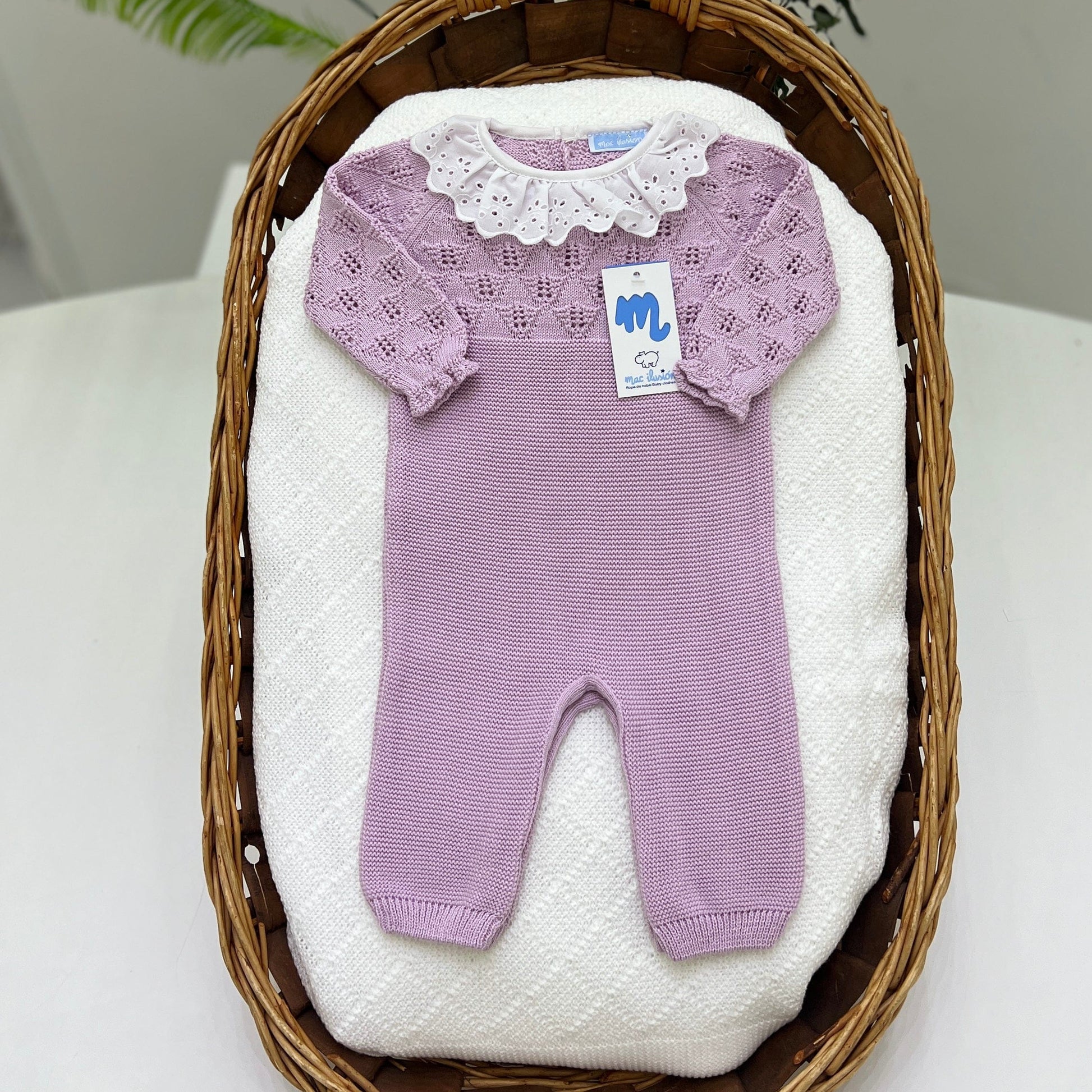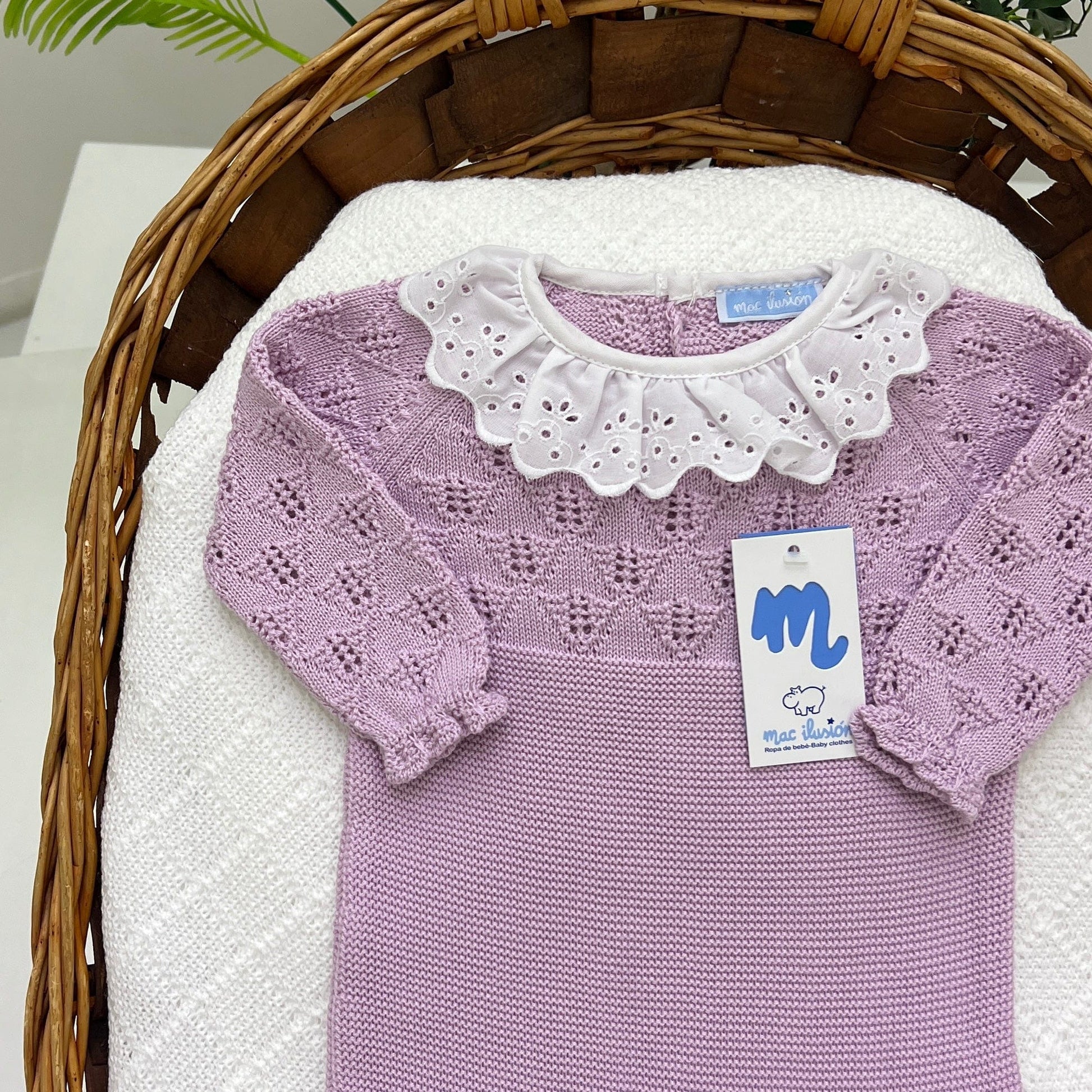 Tutina intera per neonata in filo di cotone con lavorazione traforata, completata da un colletto in sangallo. Elegante e delicata, perfetta per le occasioni più speciali.