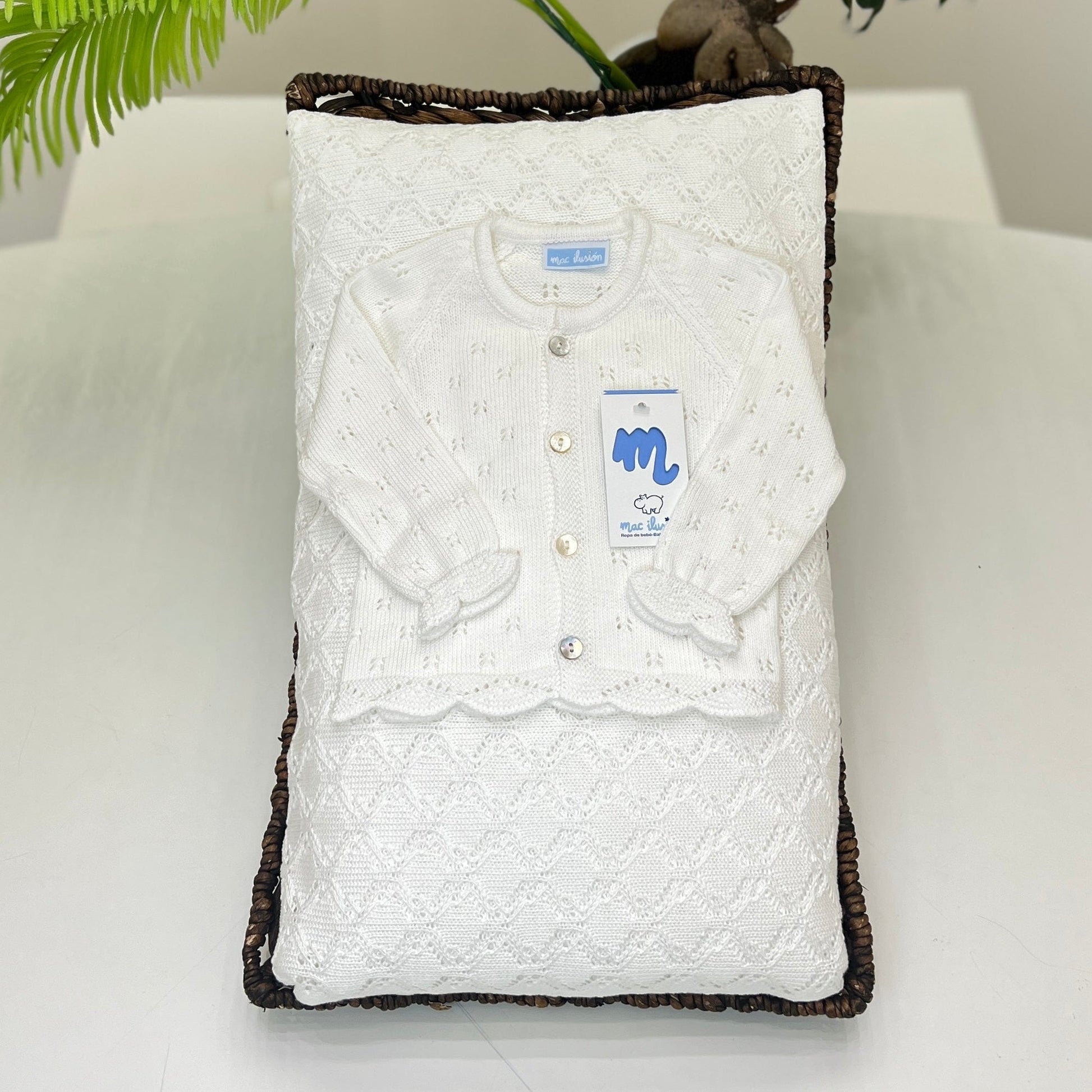 Cardigan in morbido filo di cotone traforato, impreziosito da bottoncini in madreperla. Un capo elegante e delicato, ideale per aggiungere un tocco di stile e comfort al guardaroba del tuo piccolo.