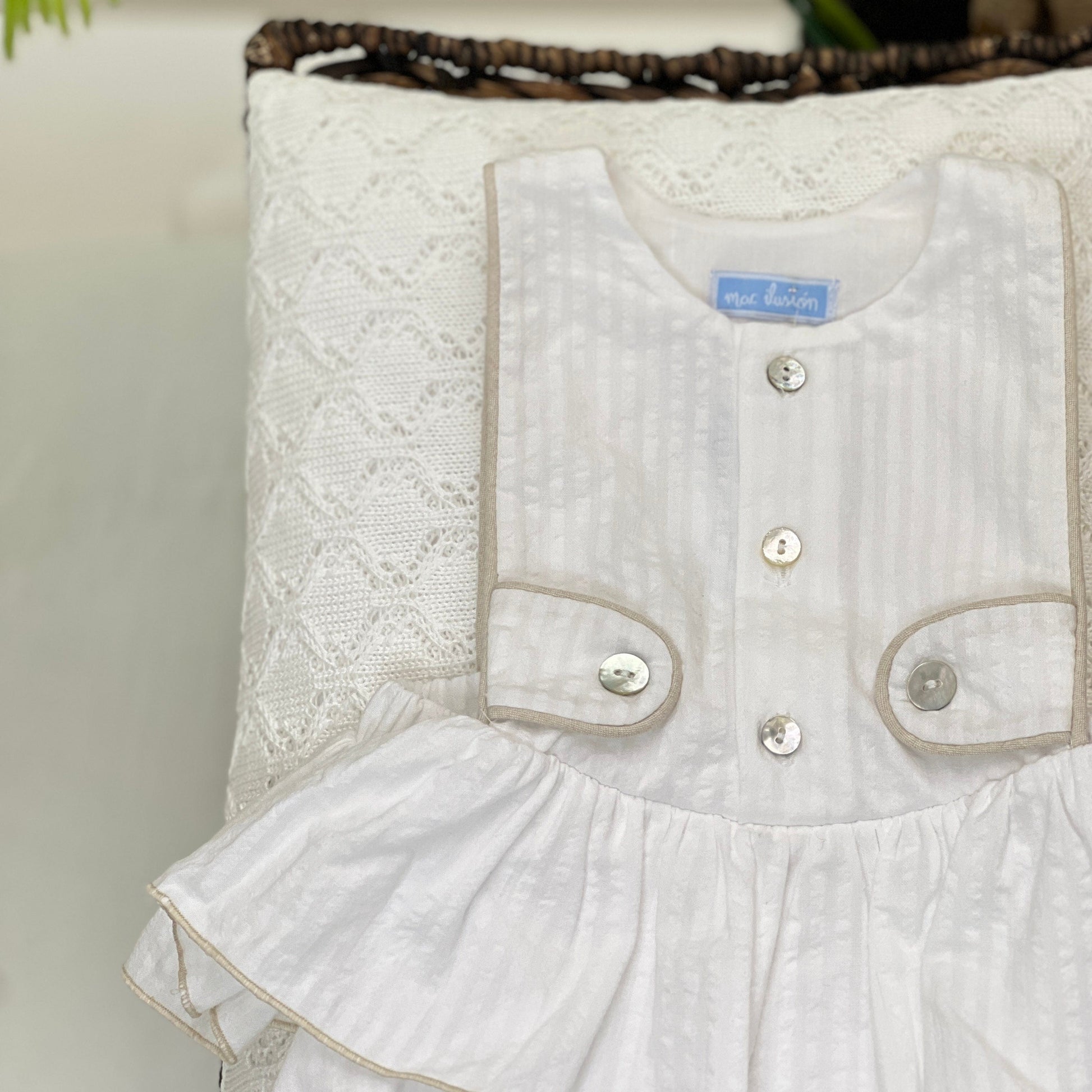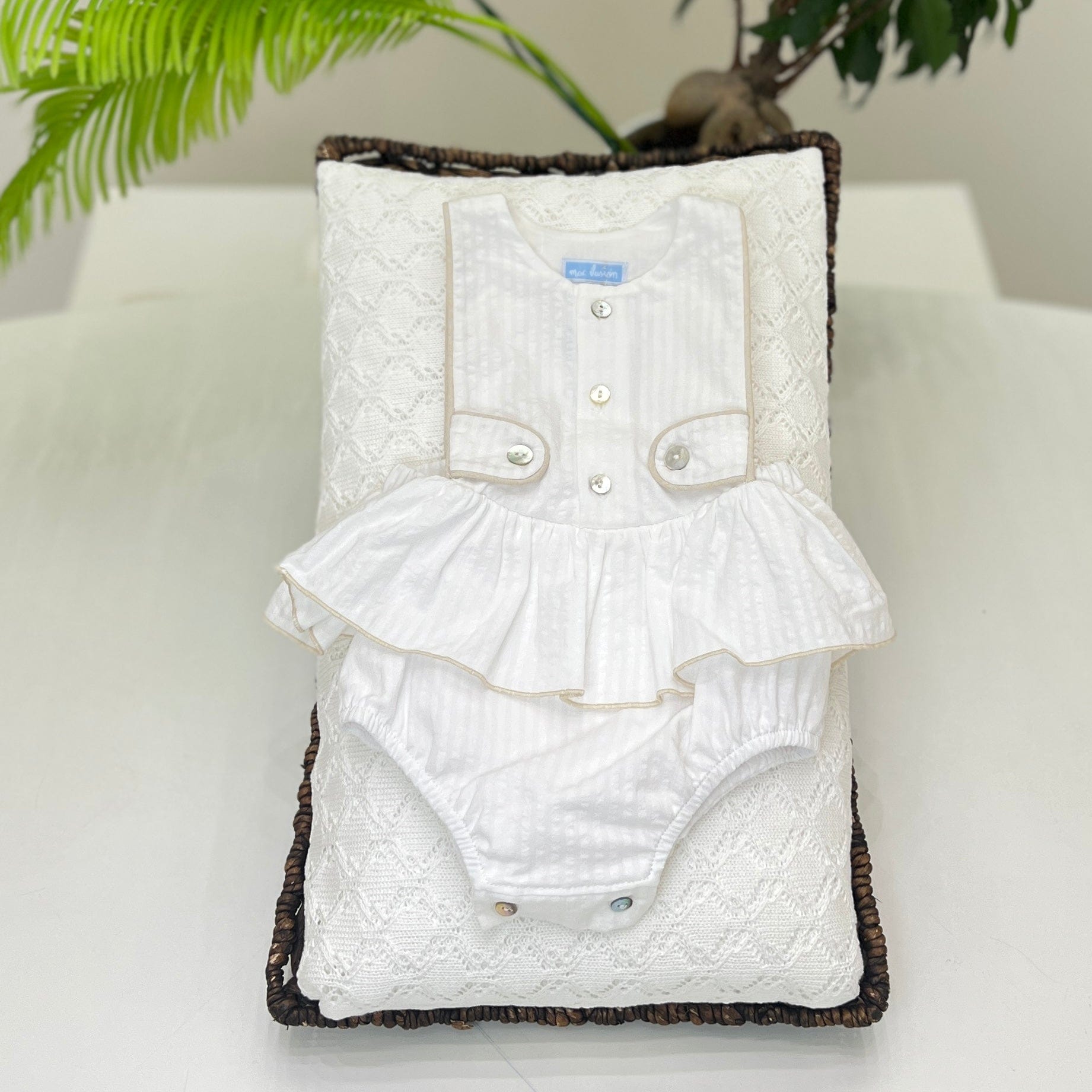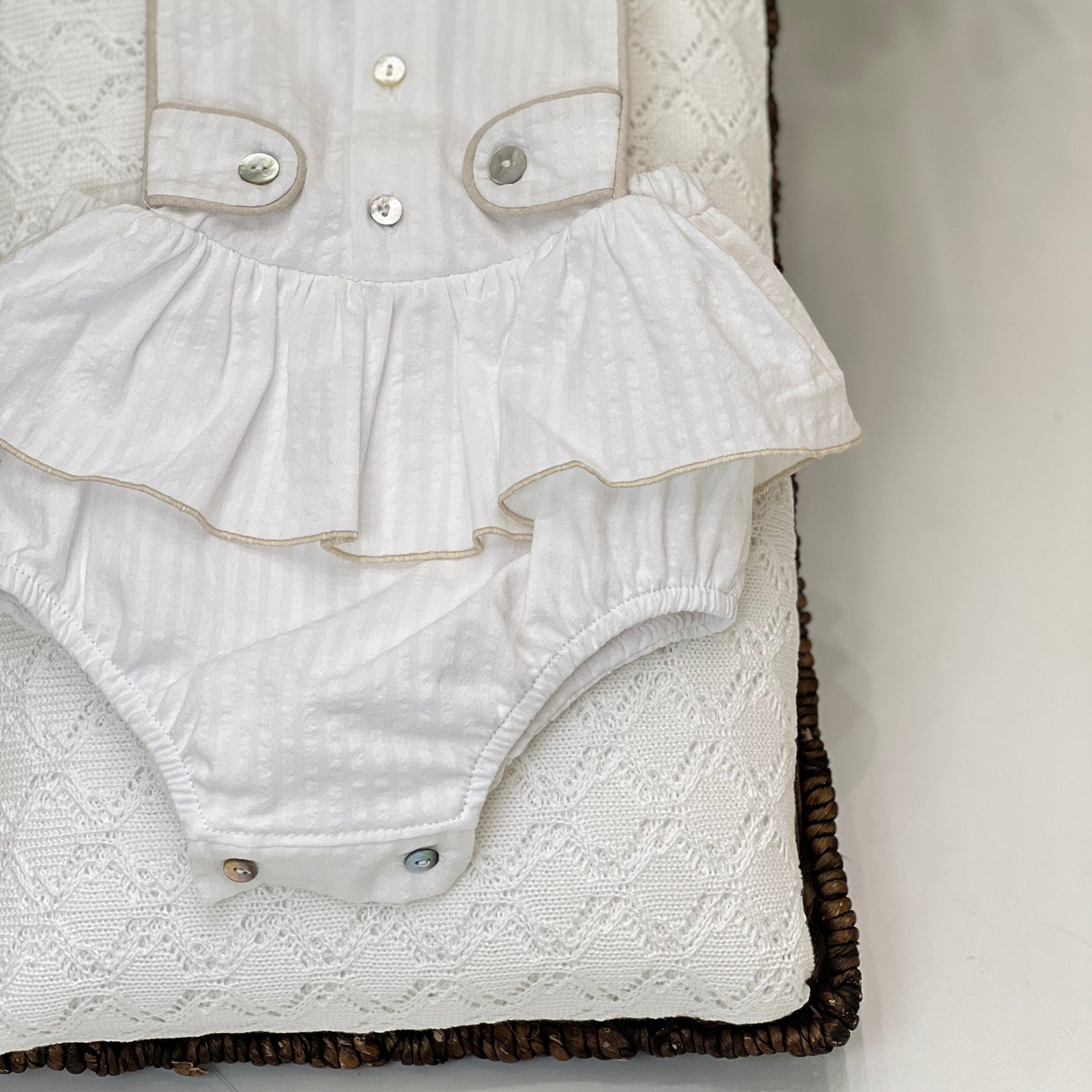 Salopette a pagliaccetto per neonata in fresco cotone, caratterizzata da una delicata balza e un design total white a righe con bordini a contrasto in beige. I bottoncini in madreperla aggiungono un tocco di eleganza, rendendo questo capo perfetto per le giornate estive del tuo piccolo.