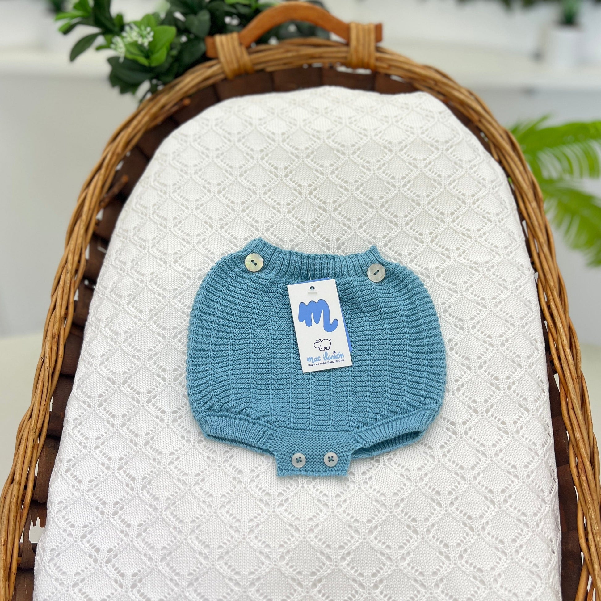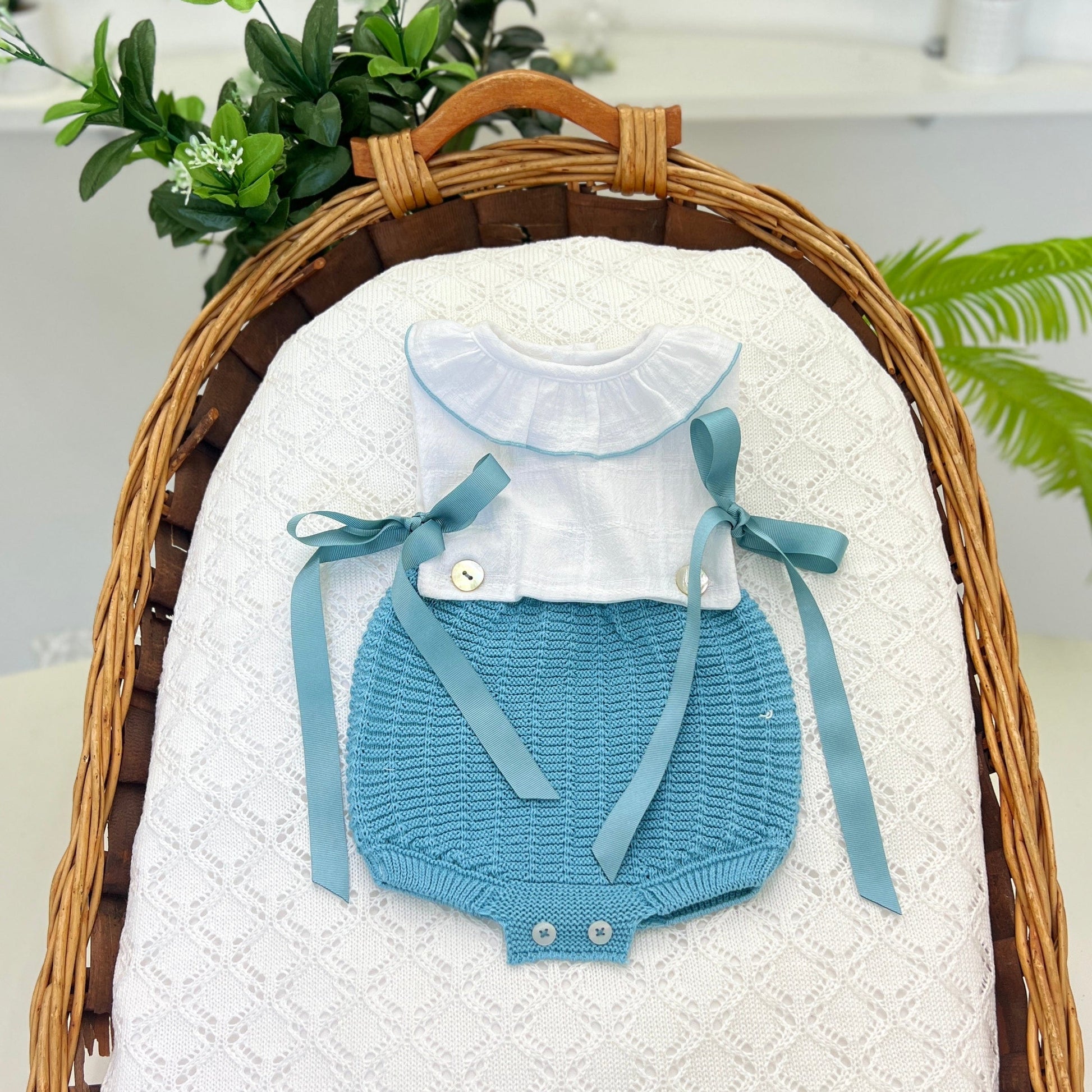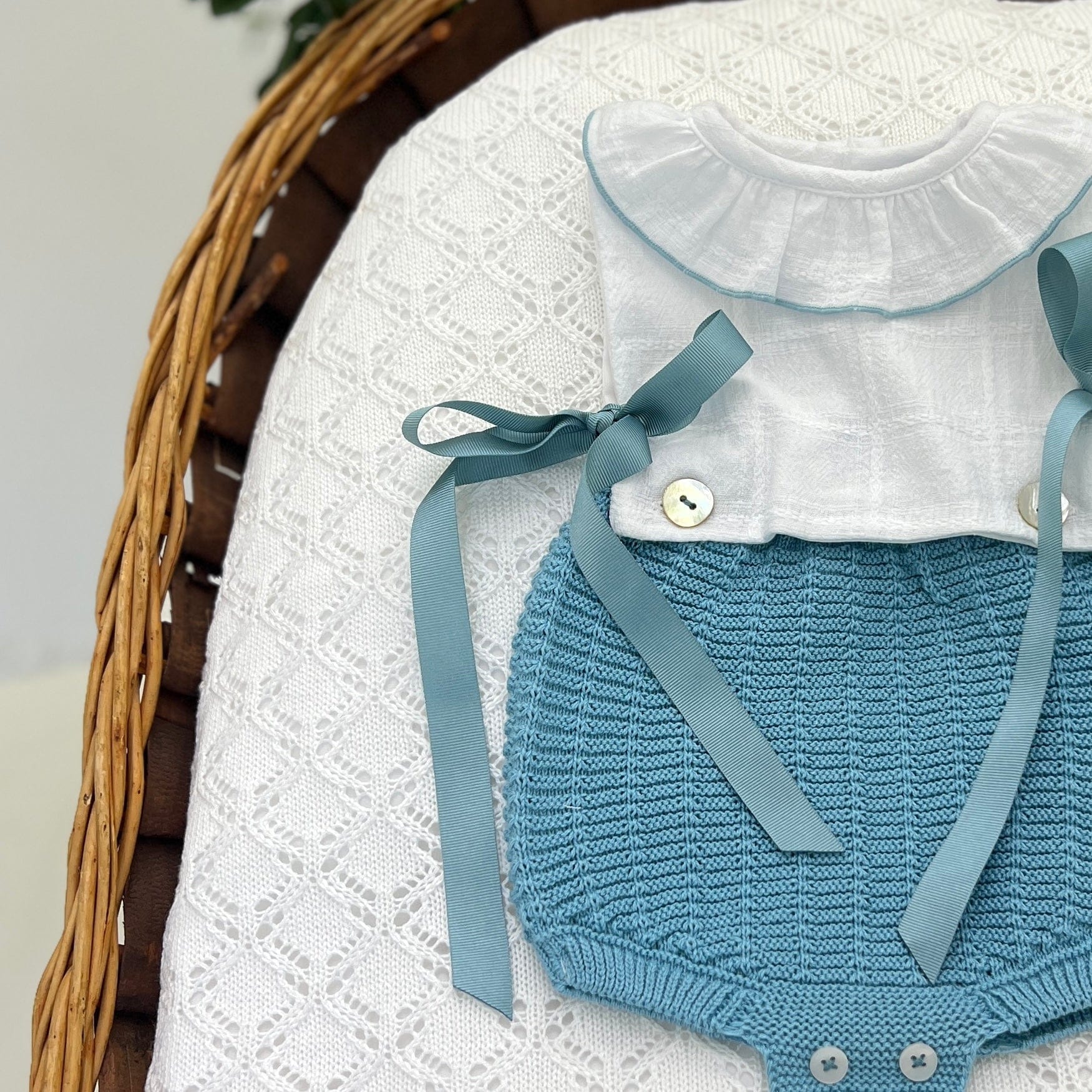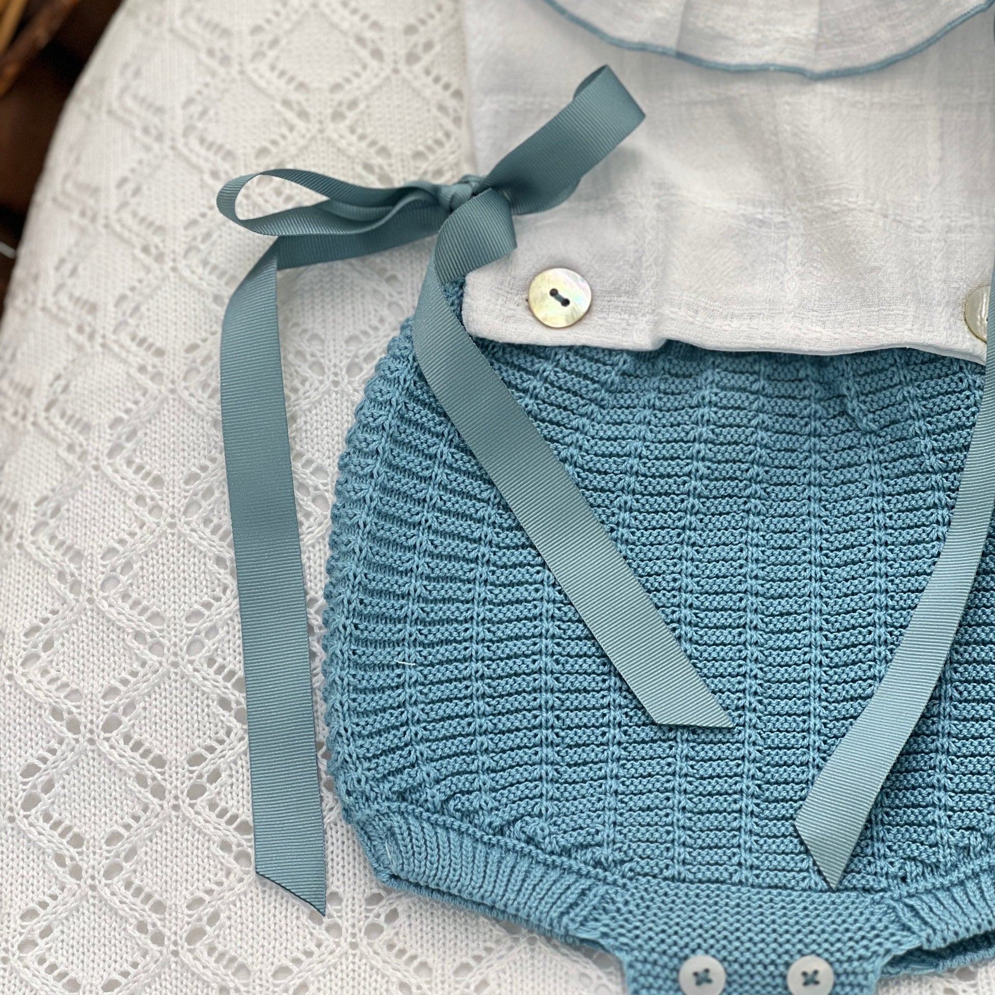 Pagliaccetto per neonata in filo di cotone e lino, con collo arricchito da rouches e fiocchetti laterali in raso. I bottoni in vita lo rendono scomponibile, permettendo di utilizzare anche solo la culotte, per un capo pratico ed elegante.