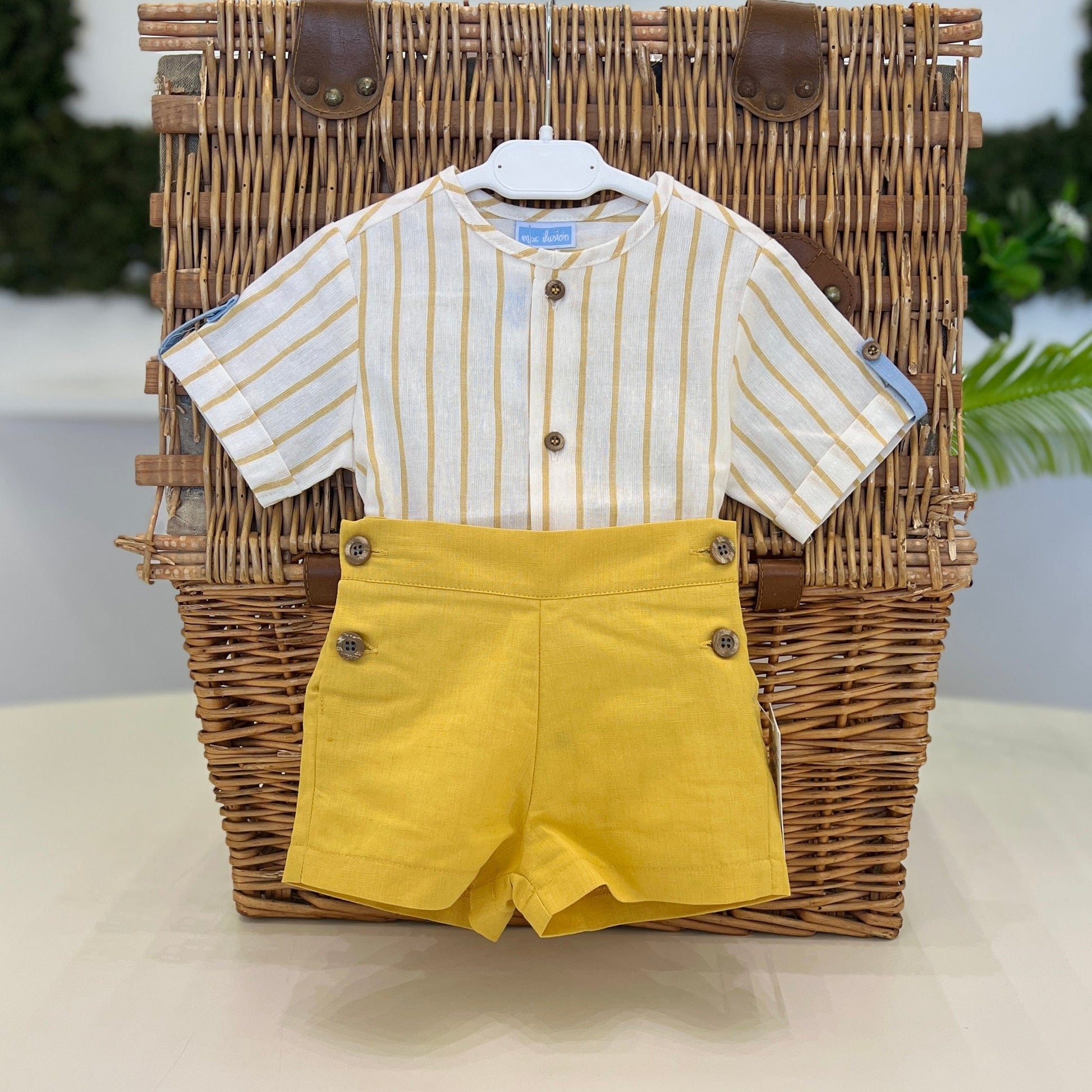 Completo bimbo in misto lino color miele, composto da camicia a righe in lino con girocollo, pantaloncini abbinati, bottoncini a contrasto ed elastico sul retro. Un look fresco e elegante, perfetto per le occasioni speciali.
