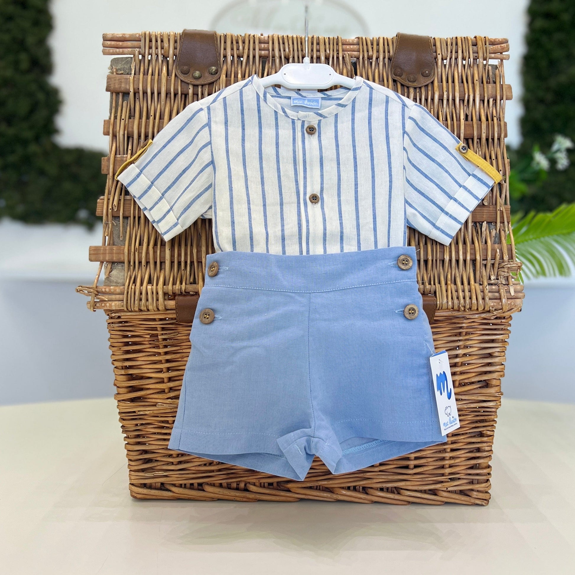 Completo bimbo in misto lino celeste e bianco, composto da camicia a righe in lino con girocollo, pantaloncini abbinati, bottoncini a contrasto ed elastico sul retro. Un look fresco e elegante, perfetto per le occasioni speciali.