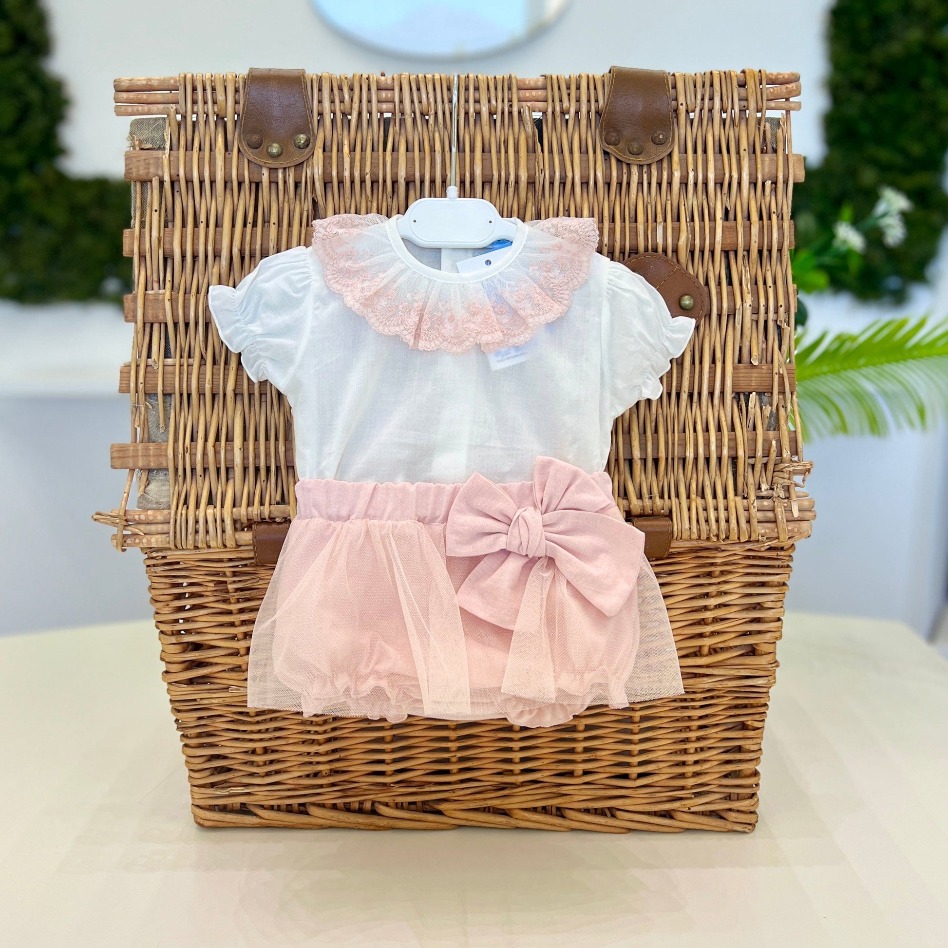 Completo per neonata composto da blusa in cotone con colletto con rouches in pizzo e culotte con fiocco e balza in tulle. Un look delicato e sofisticato, perfetto per le occasioni speciali.