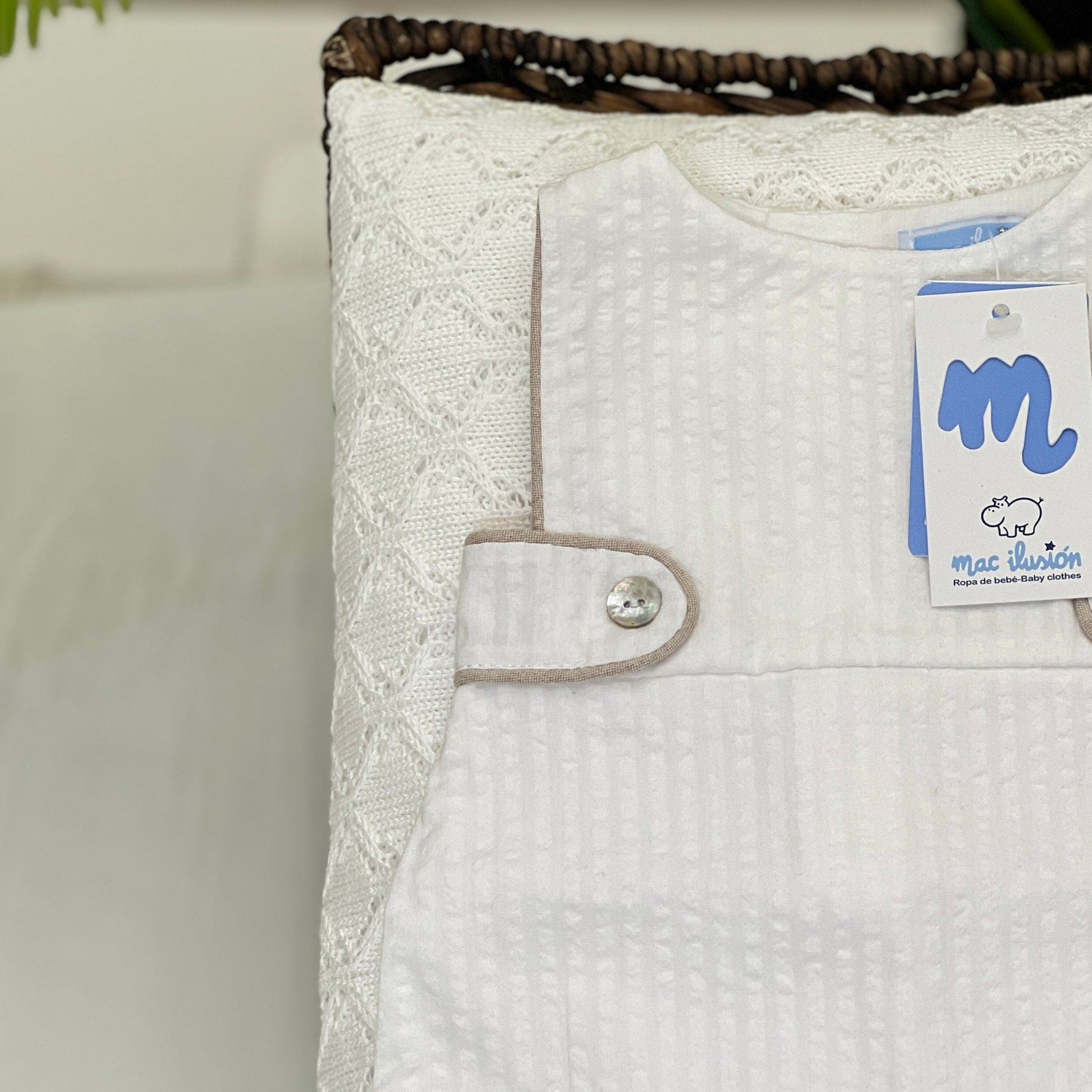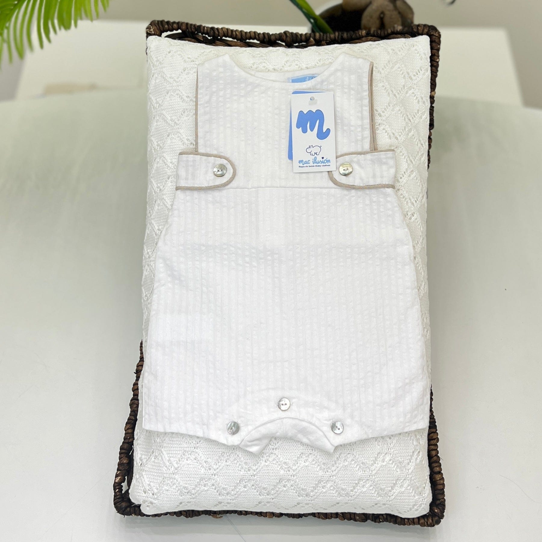 Salopette in cotone per neonato, fresca e comoda, in elegante total white con bordi beige e bottoncini in madreperla. Un capo semplice e raffinato, ideale per garantire comfort e stile al tuo piccolo in ogni occasione
