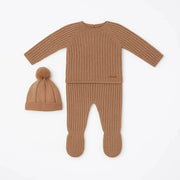 Tutina spezzata in misto lana per neonato con ghettine e cuffia coordinata, realizzata con trama lavorata all’uncinetto.