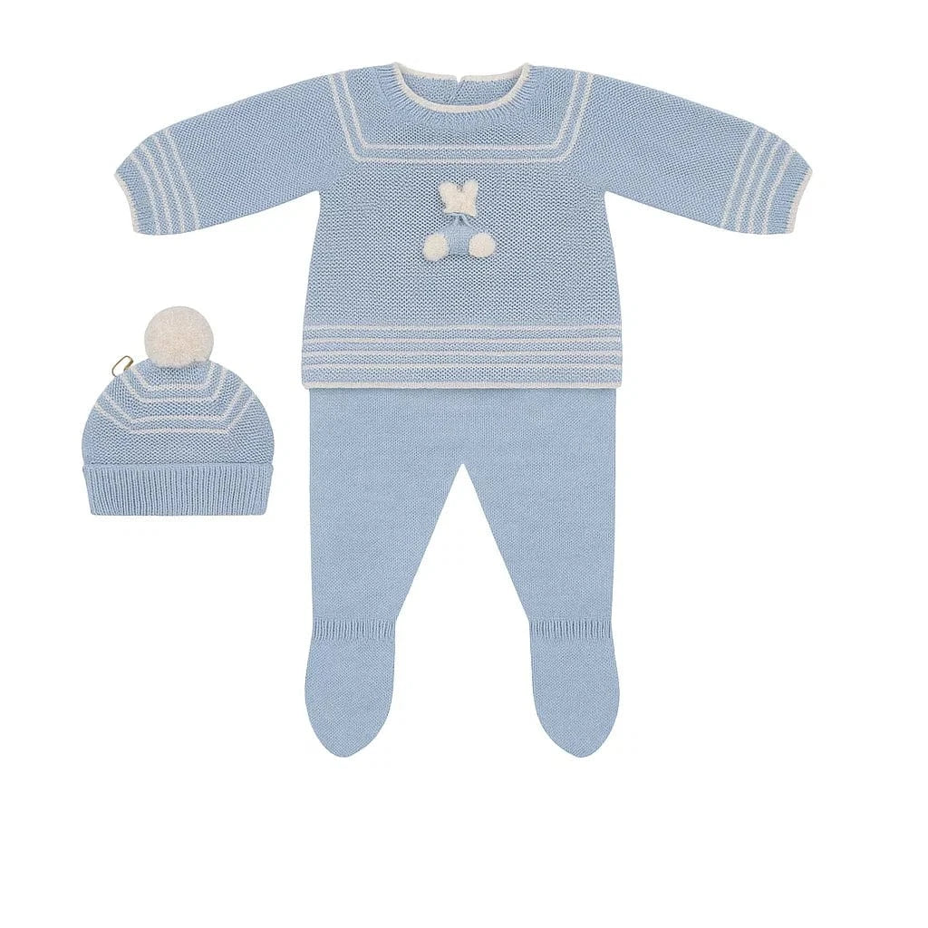 Tutina spezzata per neonato con ghettine e bordi a contrasto, completata da cappellino coordinato con pompon.