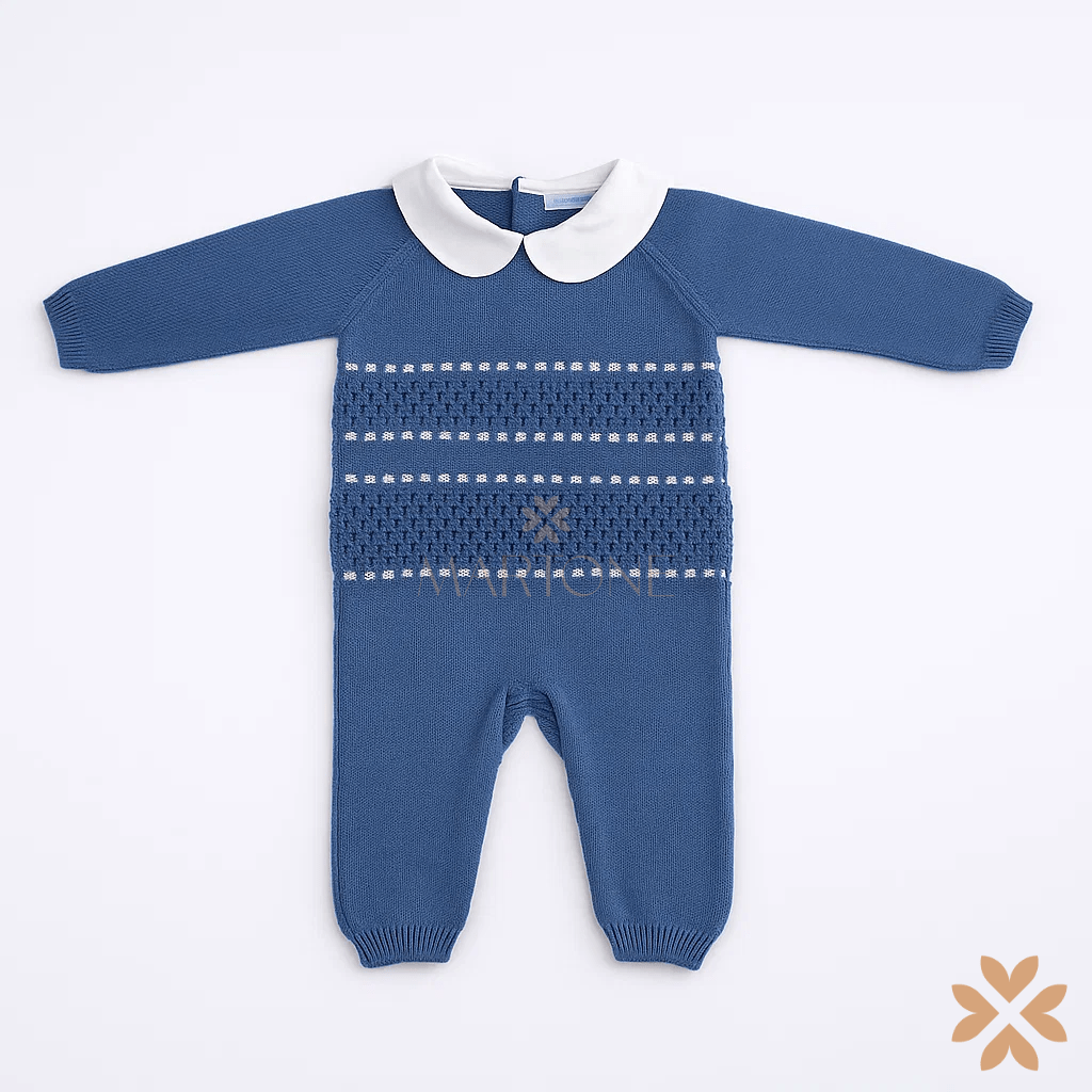 Tutina neonato in maglia azzurra, con lavorazione a punto sul corpino e inserti bianchi a contrasto. Colletto in tessuto bianco e chiusura pratica sul retro.