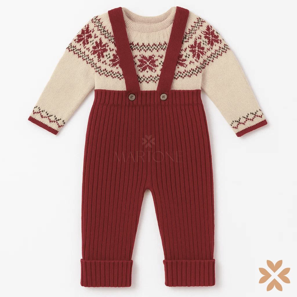 Salopette abbinata a maglia in tricot con fantasia jacquard a tema invernale, nei toni del rosso e verde su fondo panna. Un completo caldo e raffinato, ideale per la stagione fredda.